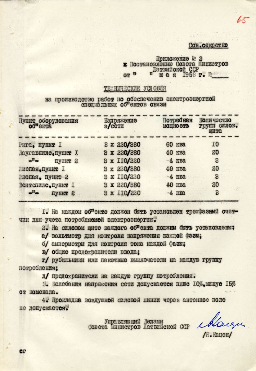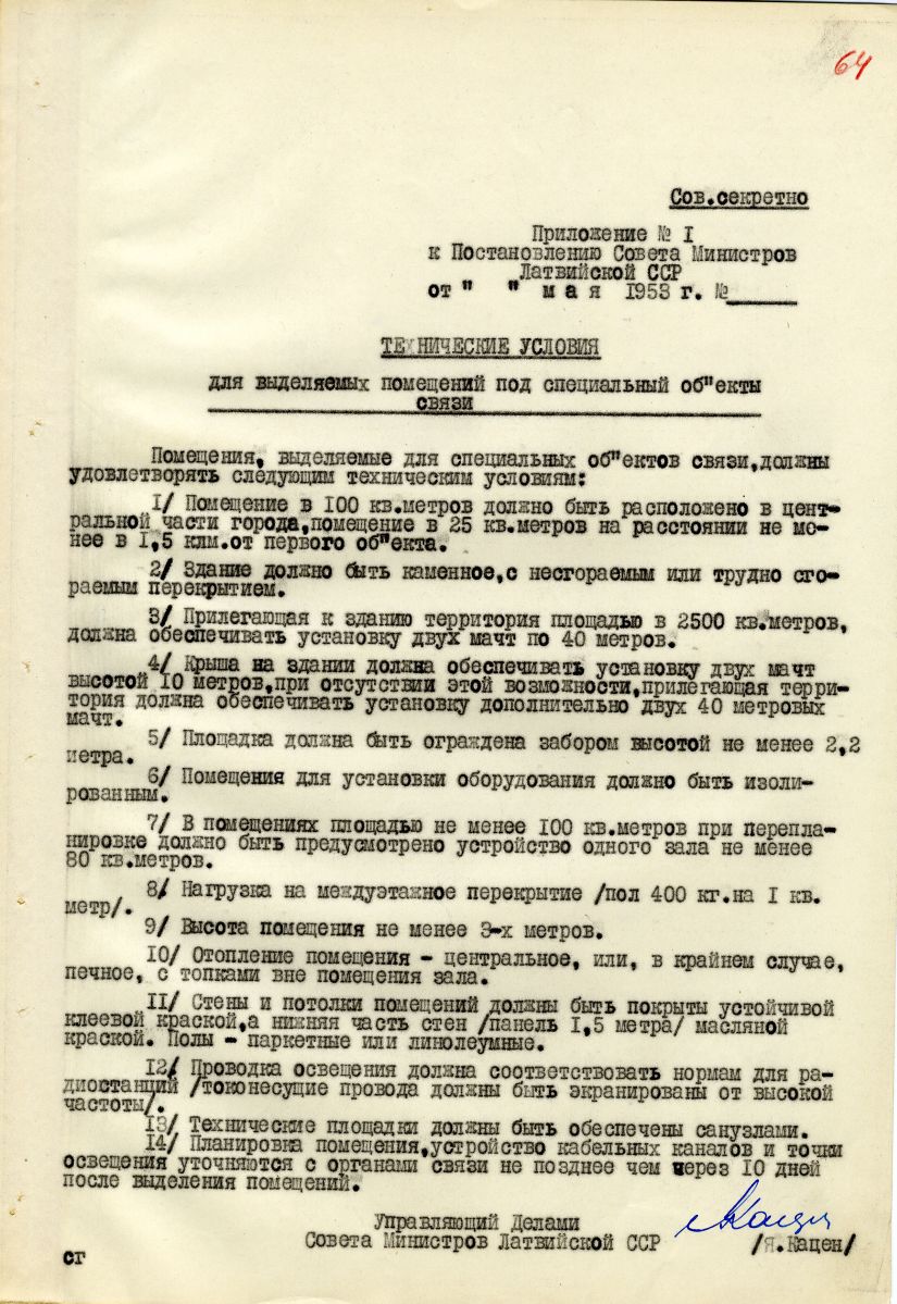 Lēmuma pielikumā – tehniskie nosacījumi telpām, kas paredzētas speciālo sakaru objektiem. Tajos teikts, ka telpām 100 m² platībā jāatrodas pilsētas centrā, bet 25 m² telpām ne mazāk kā 1, 5 km attālumā no pirmā objekta, tām jābūt no akmens, jumtiem jābūt tādiem, lai varētu uzstādīt divus mastus 10 metru augstumā, gadījumā, ja nav iespējams to izdarīt uz jumta, tad jābūt iespējai pie objekta uzstādīt 40 metru mastu.