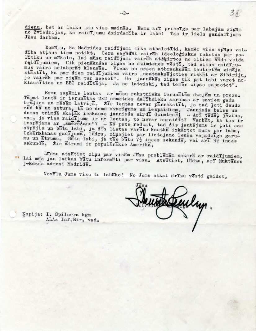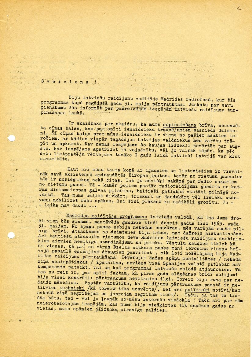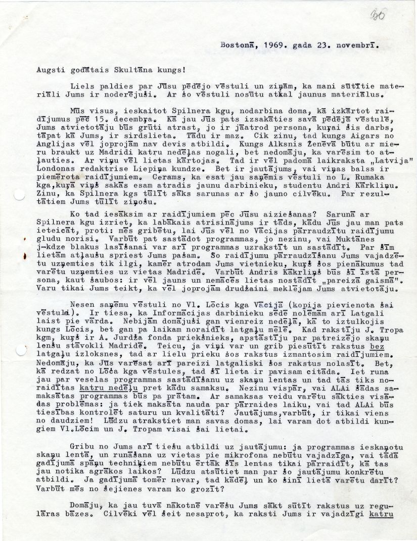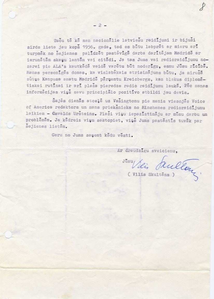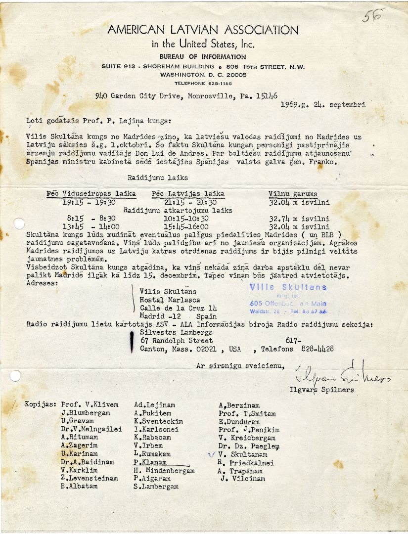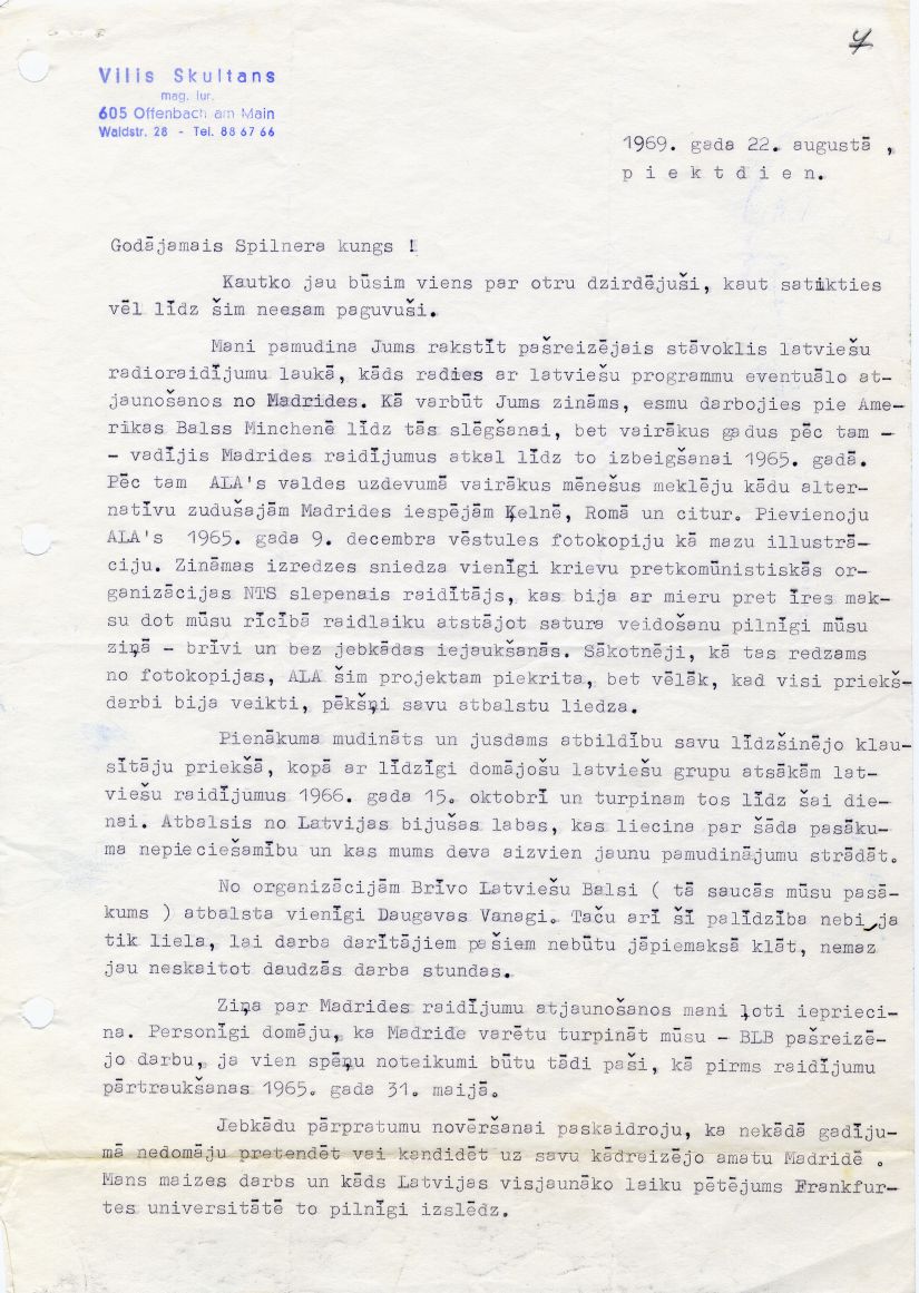 Madrides raidījumu latviešu valodā redaktora Viļa Skultāna vēstule Amerikas latviešu apvienības Informācijas biroja vadītājam Ilgvaram Spilneram par Amerikas latviešu apvienības eventuālo atbalstu raidījumu no Madrides atjaunošanā. 1969. gada 22. augusts.
