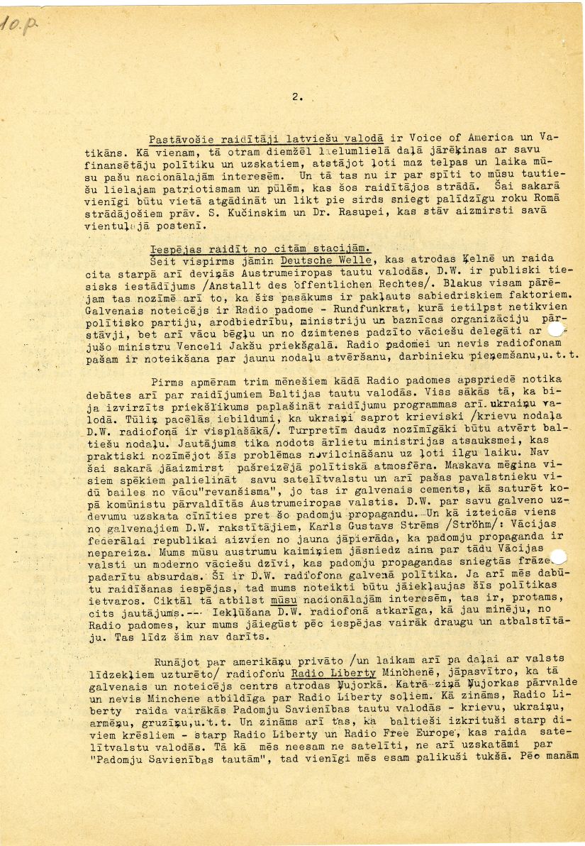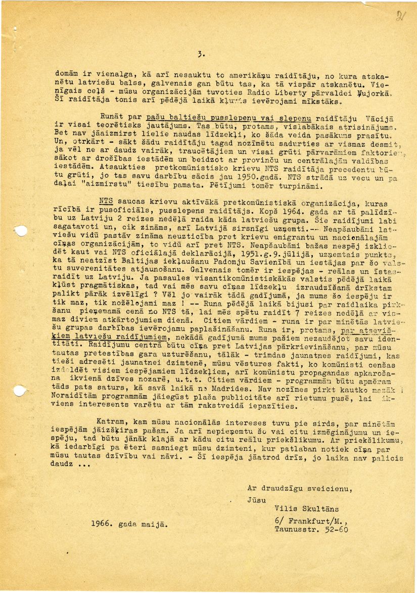 Programmas "Brīvā latviešu balss" redaktora Vācijā Viļa Skultāna apkārtraksts par iespējām un nepieciešamību turpināt raidīt latviešu valodā uz okupēto Latviju. 1966. gada maijs.
