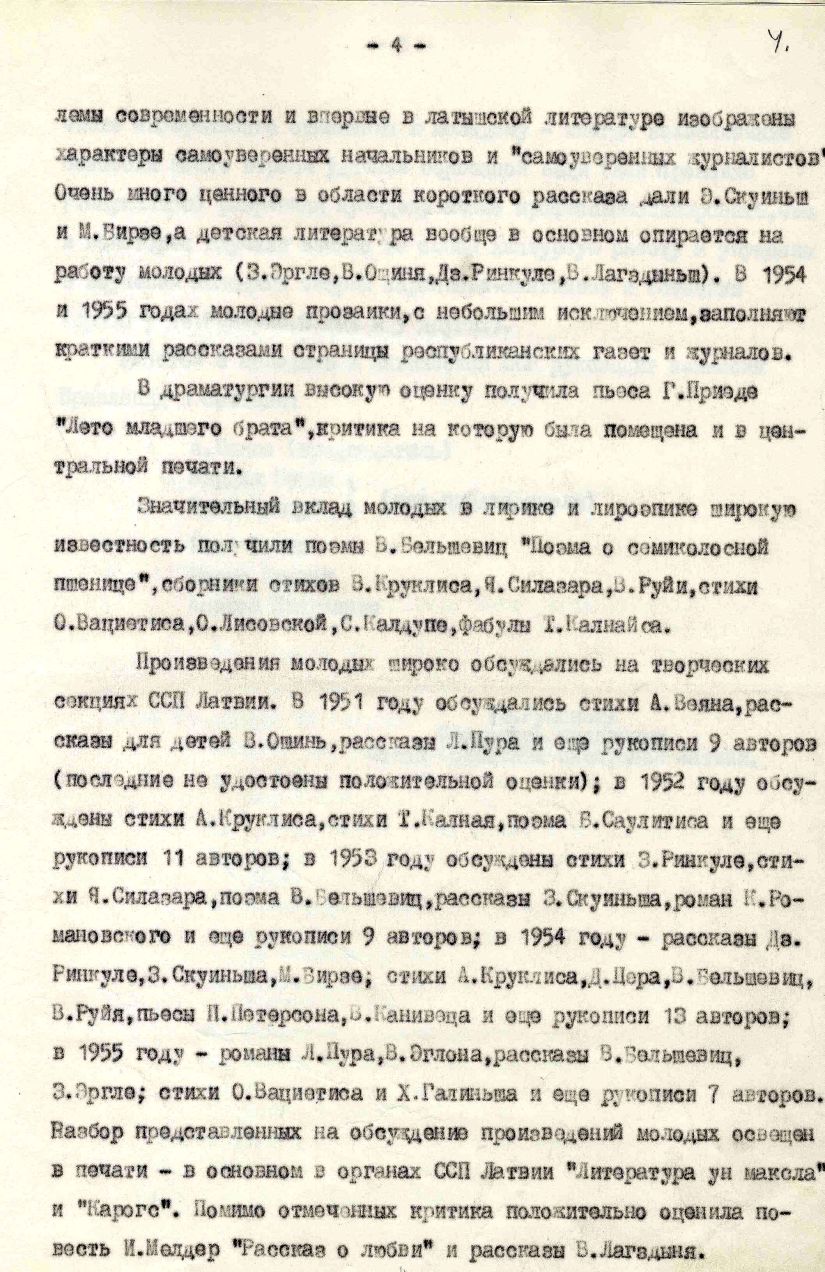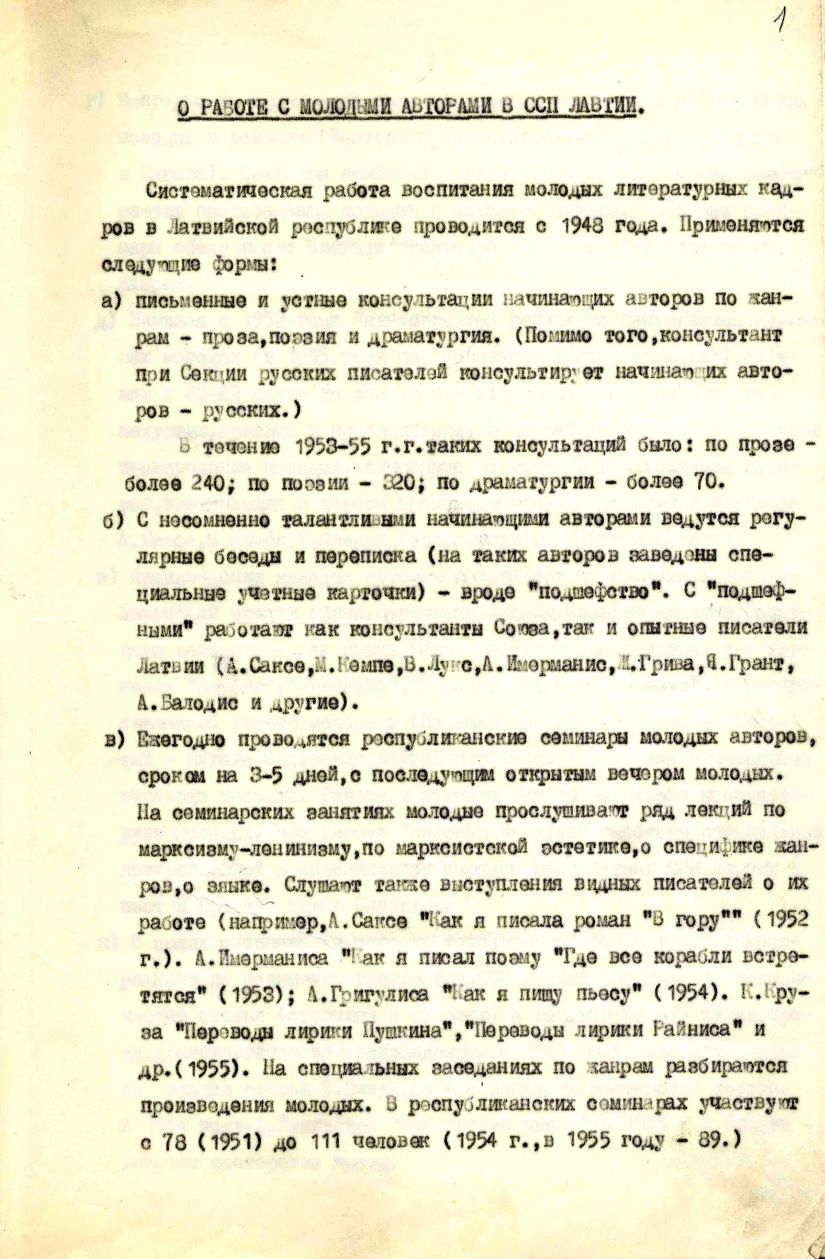 Ieskatam piedāvājam atsevišķus dokumentus un to fragmentus no Latvijas Rakstnieku savienības (473. fonds), Latvijas Padomju rakstnieku savienības Latvijas Komunistiskās partijas (LKP) pirmorganizācijas (PA-7263. fonds), Latvijas Komunistiskās partijas Centrālā Komitejas (PA-101. fonds), Izdevniecības "Liesma" (478. fonds) un Izdevniecības "Liesma" LKP pirmorganizācijas (PA-885. fonds).