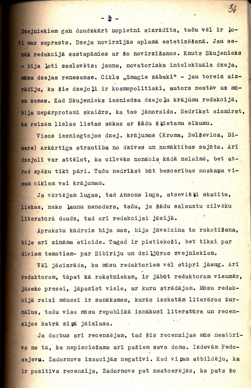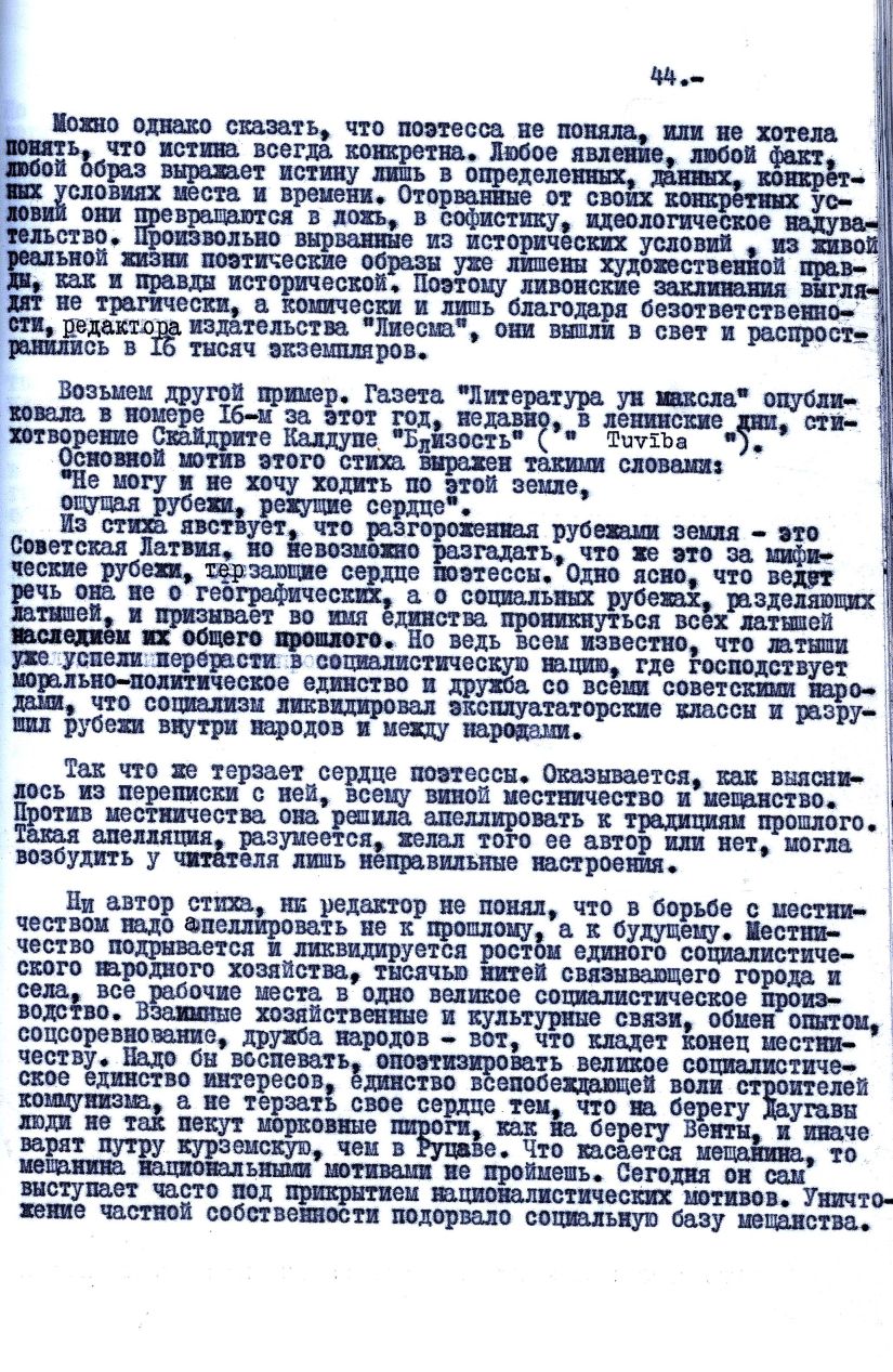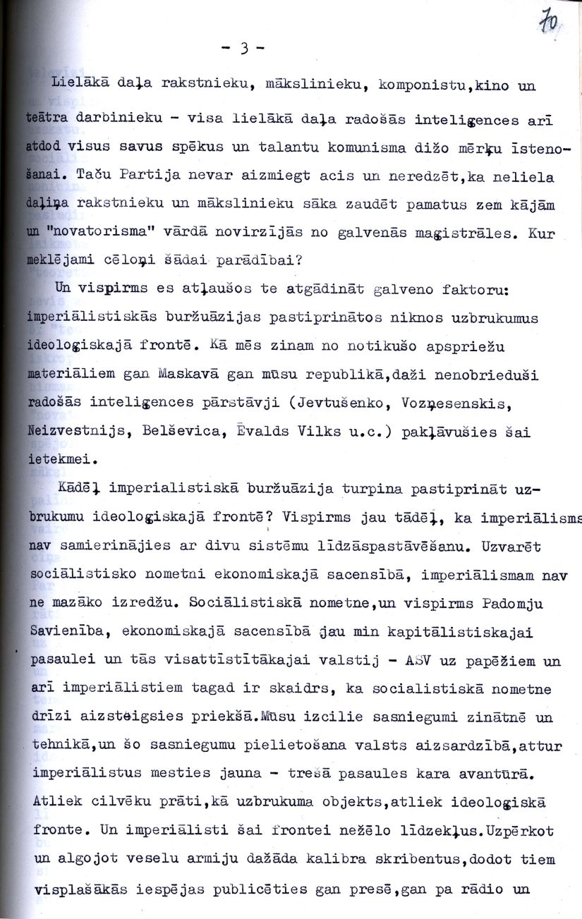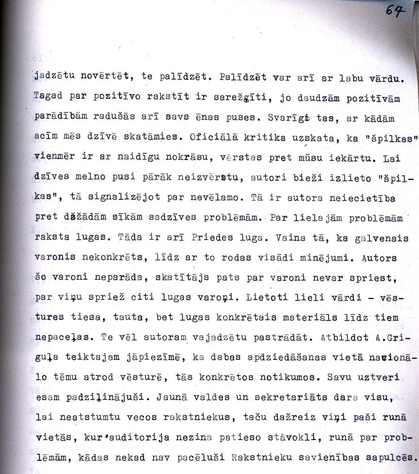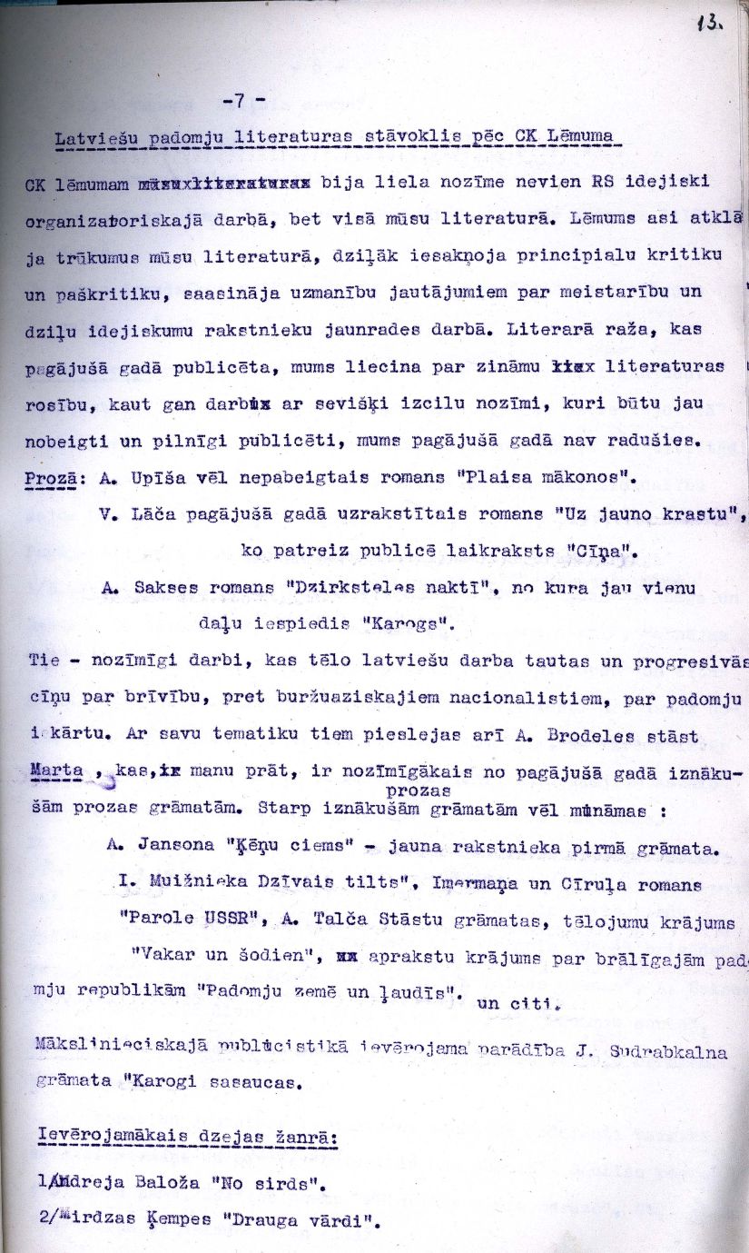 Latvijas Padomju rakstnieku savienības partijas pirmorganizācijas sapulcē 1951. gada 8. februārī lasītā Žaņa Folkmaņa referāta "LK(b) CK biroja 25. aprīļa lēmuma "Par Latvijas Padomju rakstnieku savienības darbu" izpilde" fragments.