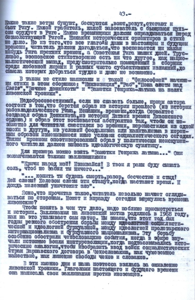 LKP CK partijas komisijas priekšsēdētāja Roberta Ķīša uzstāšanās debatēs LKP CK XI plēnumā 1969. gada 11. jūnija sēdē "Par radio, televīzijas, preses un kino lomas paaugstināšanu republikas darbaļaužu komunistiskajā audzināšanā": "..Vizmas Belševicas dzejoļi ir Ēzopa valodas paraugs, kur vārdi piemeklēti tā, lai tautu aizvestu no skaidras domas uz minējumu miglu. Lai tauta klausās un min... Buršanās par Livonijas motīvu radās 1968. gadā, kā to norāda pati autore. Mēs zinām, ka šajā gadā saasinājās cīņa starp sociālistisko un buržuāzisko ideoloģiju, starp proletārisko internacionālismu un buržuāzisko nacionālismu. Šo cīņu sevišķi saasināja Čehoslovākijas notikumi, kad ēterā skanēja kontrrevolūcijas vaimanas, kad tika piemeklētas vēsturiskās analoģijas, lai Varšavas līguma valstu karaspēka ievešanu Čehoslovākijā attēlotu kā svešzemju uzbrukumu, kā zaudējumu čehu un slovāku brīvībai. Un tieši šajās dienās mūsu dzejniece ķērās pie Livonijas hronikas atdzīvināšanas. Ar nākotnes un pagātnes darbības vārdiem viņa uzrakstīja savus lāstus svešzemniekiem."