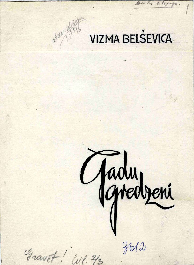 Vizmas Belševicas grāmatas "Gadu gredzeni" vāka makets. Mākslinieks Kārlis Vidiņš. 1968. gads. Oriģināls, glabājas izdevniecības "Liesma" fondā.