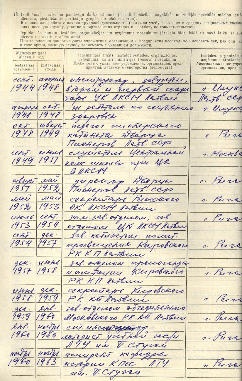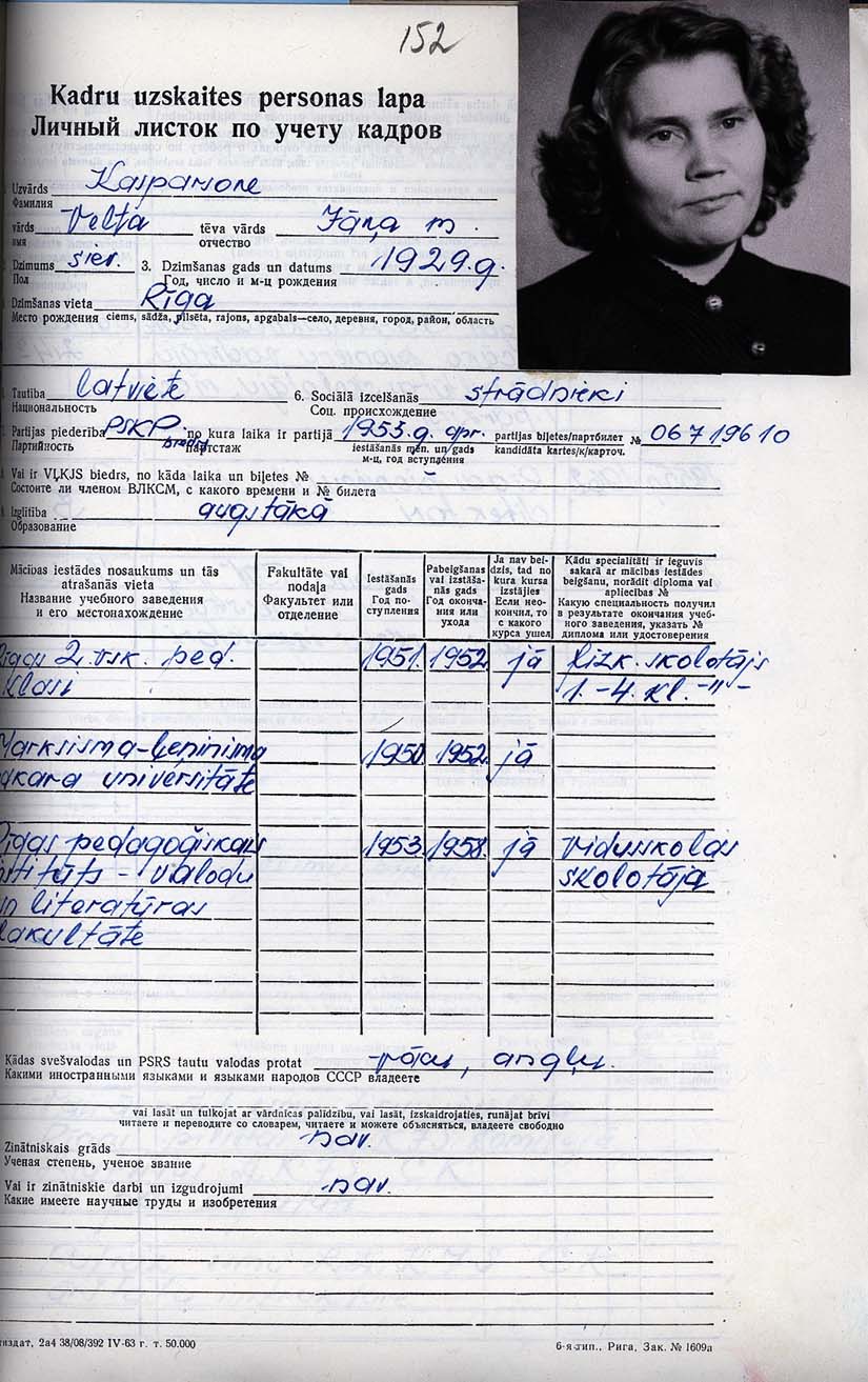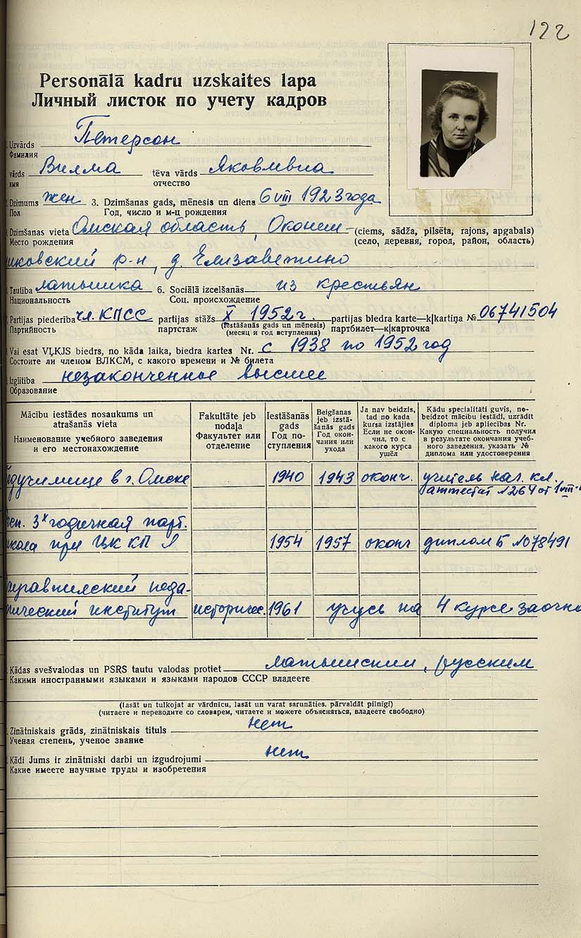 Pionieru pils direktores Vilmas Pētersones personālā kadru uzskaites lapa.