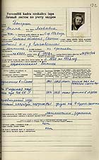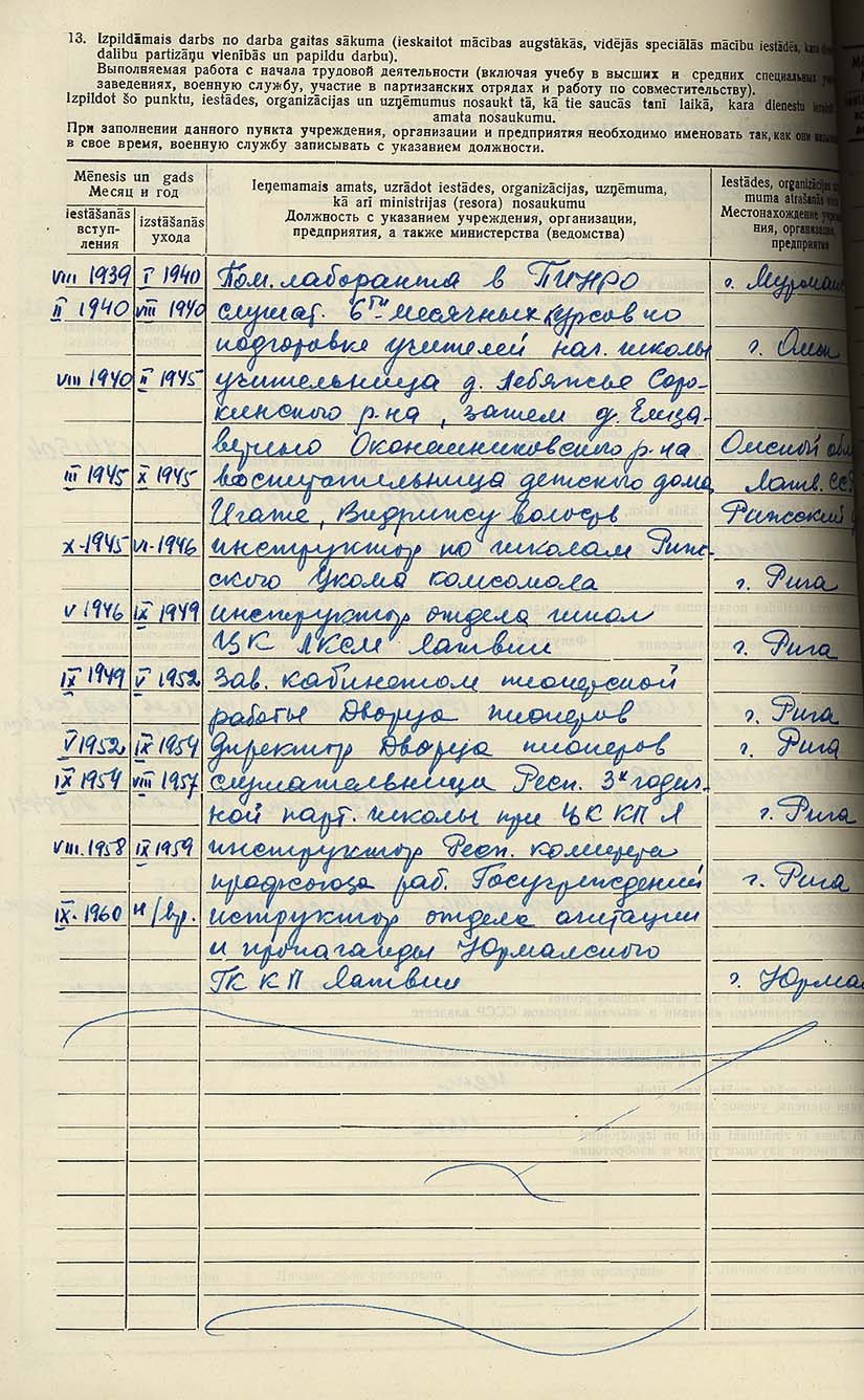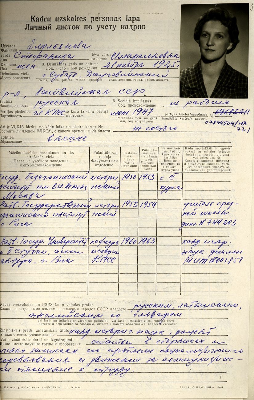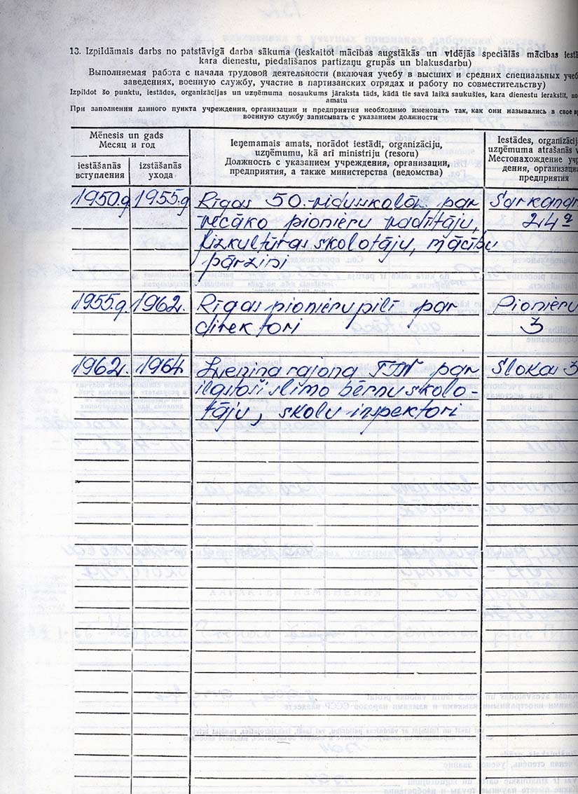 Pionieru pils direktores Stefanidas Jemeļjanovas personālā kadru uzskaites lapa.