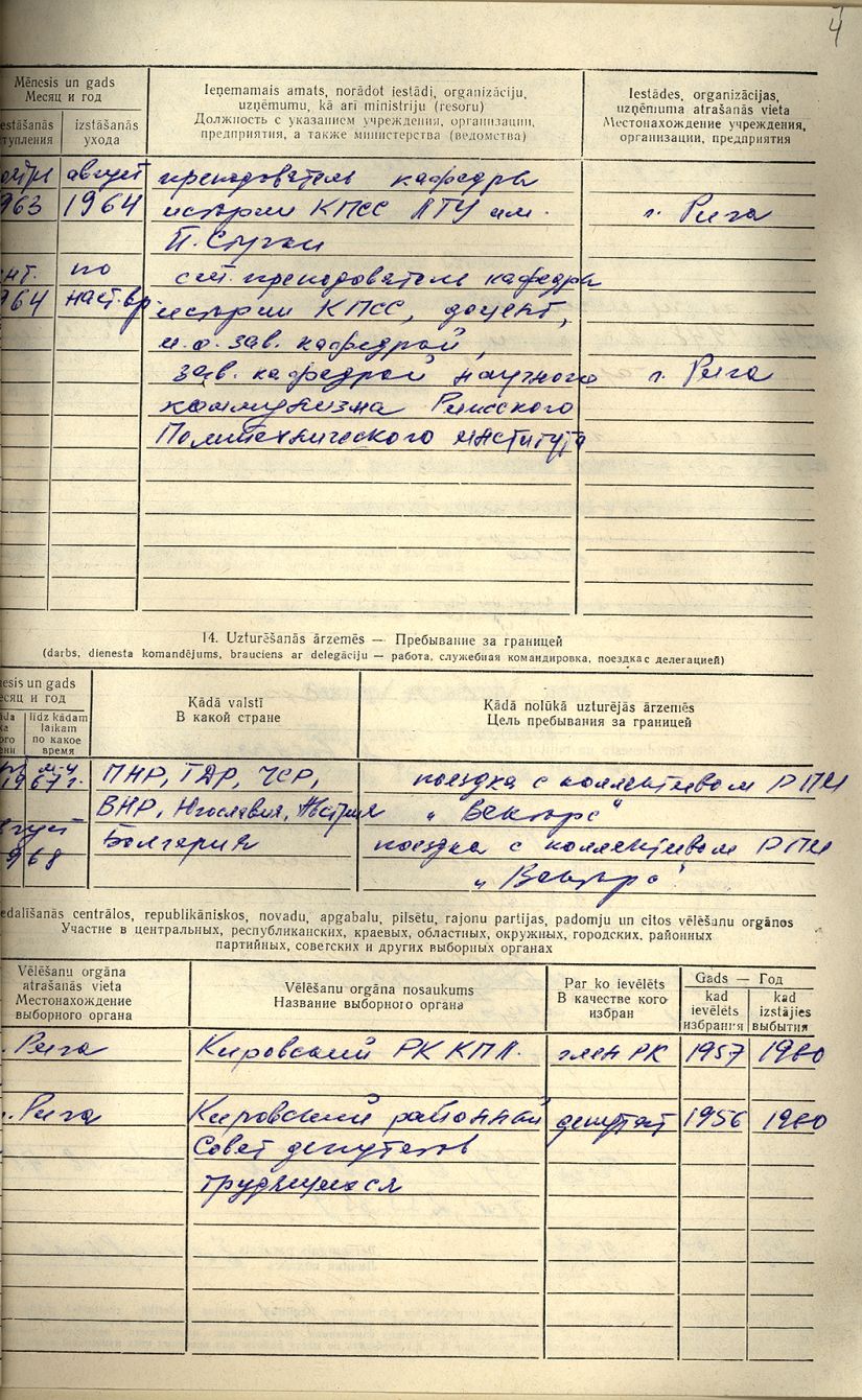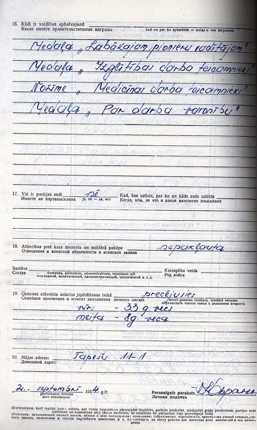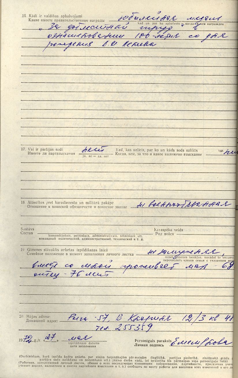 Pionieru pils direktores Stefanidas Jemeļjanovas personālā kadru uzskaites lapa.
