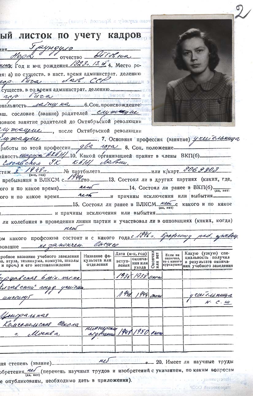 Pionieru pils direktores Noras Grundules personālā kadru uzskaites lapa.