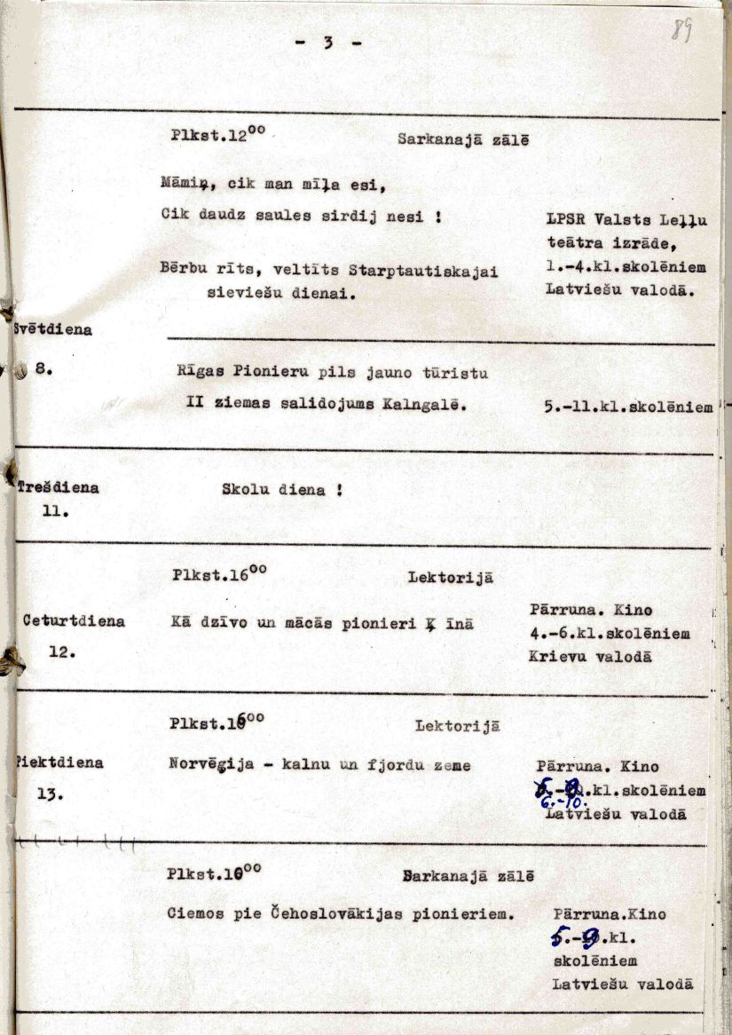 Rīgas Pionieru pils sarīkojumu plāns 1958. gada marta mēnesim.
