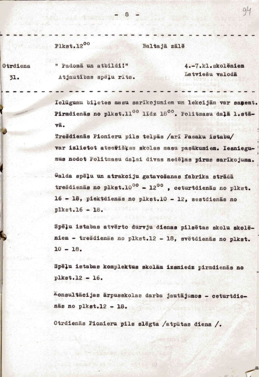 Lēmumā noteikts Latvijas PSR Pionieru pils nodot Rīgas pilsētas Darbaļaužu deputātu padomes izpildkomitejai un pārdēvēt par Rīgas Pionieru pili. |