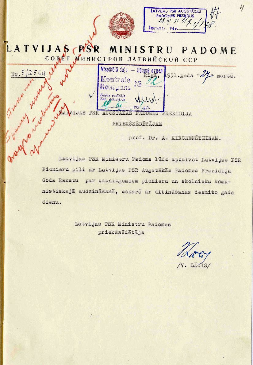 Latvijas PSR Ministru padomes priekšsēdētāja Viļa Lāča lūgums Latvijas PSR Augstākās padomes Prezidija priekšsēdētājam Augustam Kirhenšteinam apbalvot Latvijas PSR Pionieru pili ar Latvijas PSR Augstākās padomes Prezidija Goda rakstu. 1951. gada 27. marts.