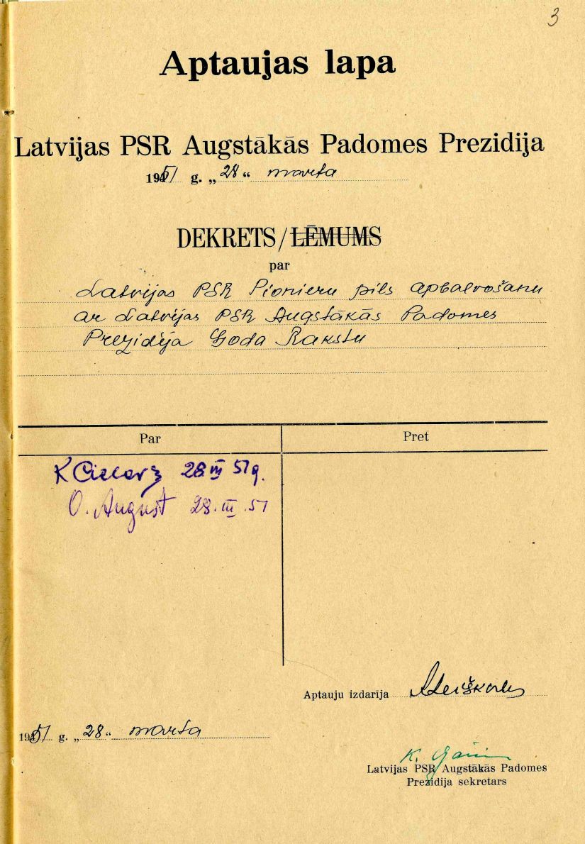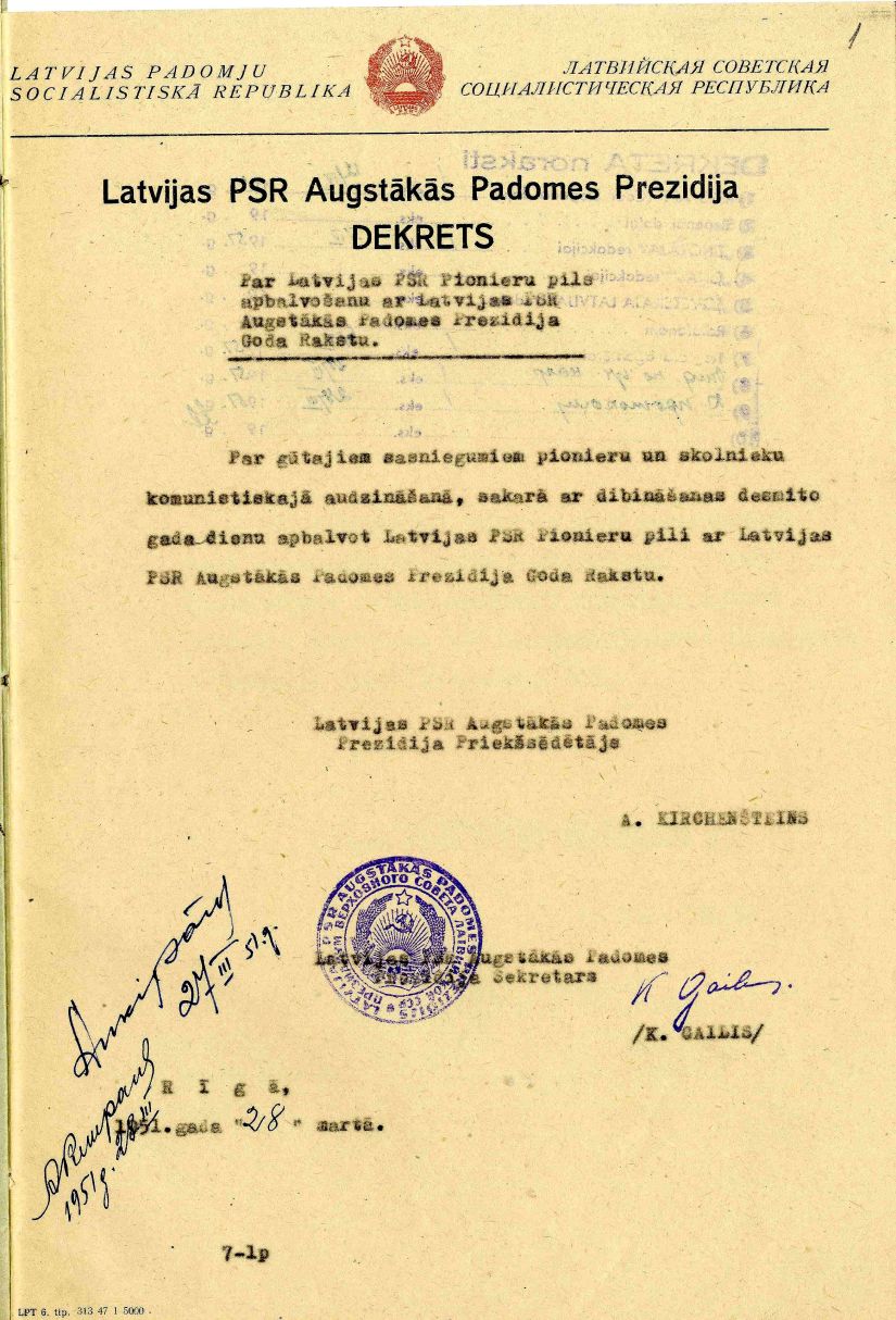 Latvijas PSR Augstākās padomes Prezidija dekrēts par Latvijas PSR Pionieru pils apbalvošanu ar Latvijas PSR Augstākās padomes Prezidija Goda rakstu. 1951. gada 28. marts.