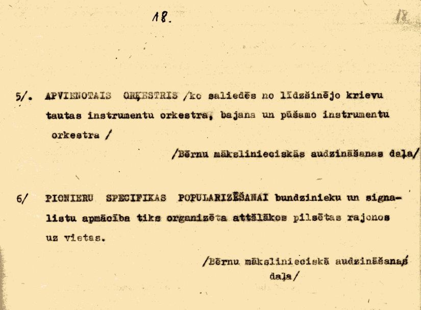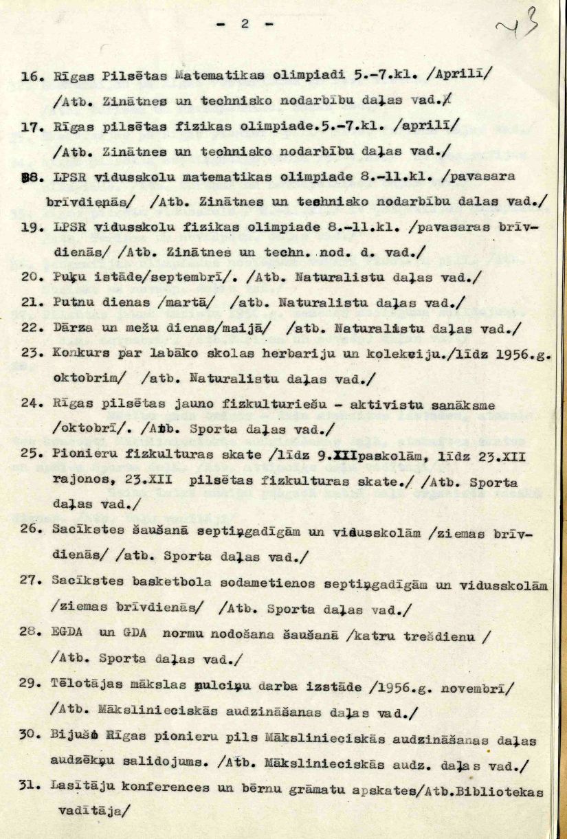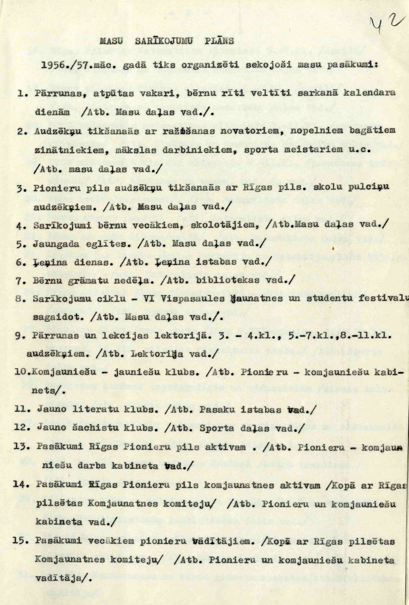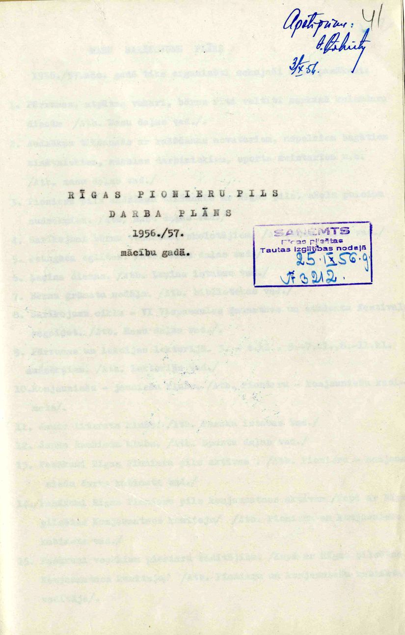 Rīgas Pionieru pils darba plāns 1956./57. mācību gadam iesniegts Rīgas pilsētas Darbaļaužu deputātu padomes izpildkomitejas Tautas izglītības nodaļā, saņemts 1956. gada 25. septembrī, apstiprināts 1956. gada 3. oktobrī.