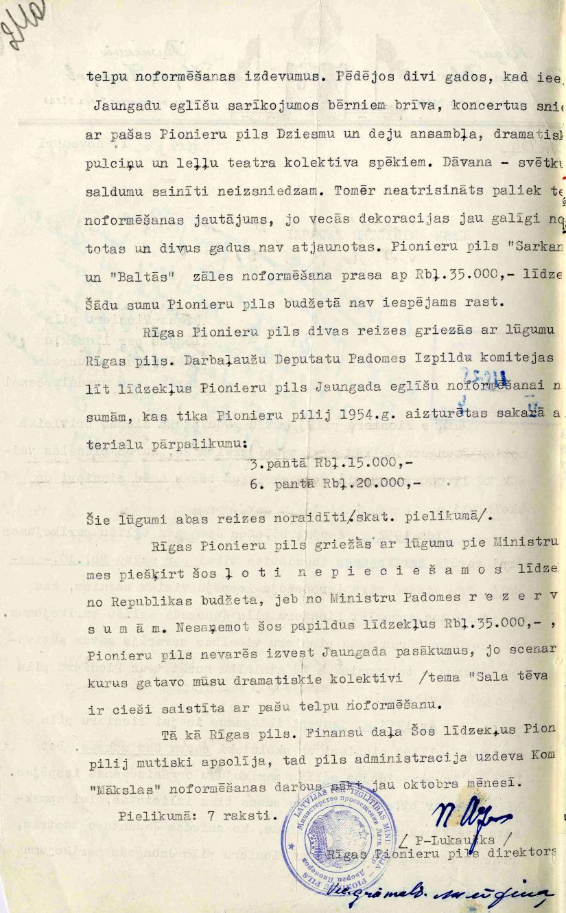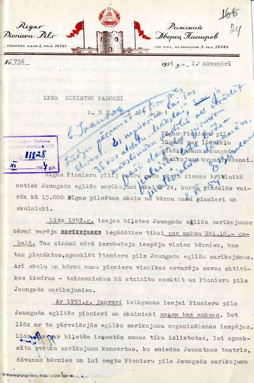 Rīgas Pionieru pils lūgums Latvijas PSR Ministru padomes priekšsēdētāja vietniekam Eduardam Berklavam par līdzekļu piešķiršanu Jaungada sarīkojumu organizēšanai. 1954. gada 1. novembris.