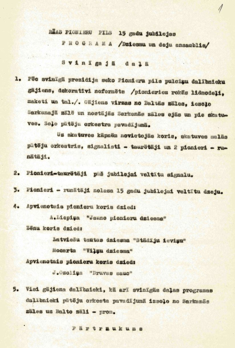 1956. gadā ar ”Svinīgo daļu” un svētku koncertu tiek atzīmēta Pionieru pils 15. gadadiena. Svinībās piedalījās delegācijas no Igaunijas un Lietuvas PSR, no Maskavas, Ļeņingradas un Latvijas lielāko pilsētu pionieru namiem.
