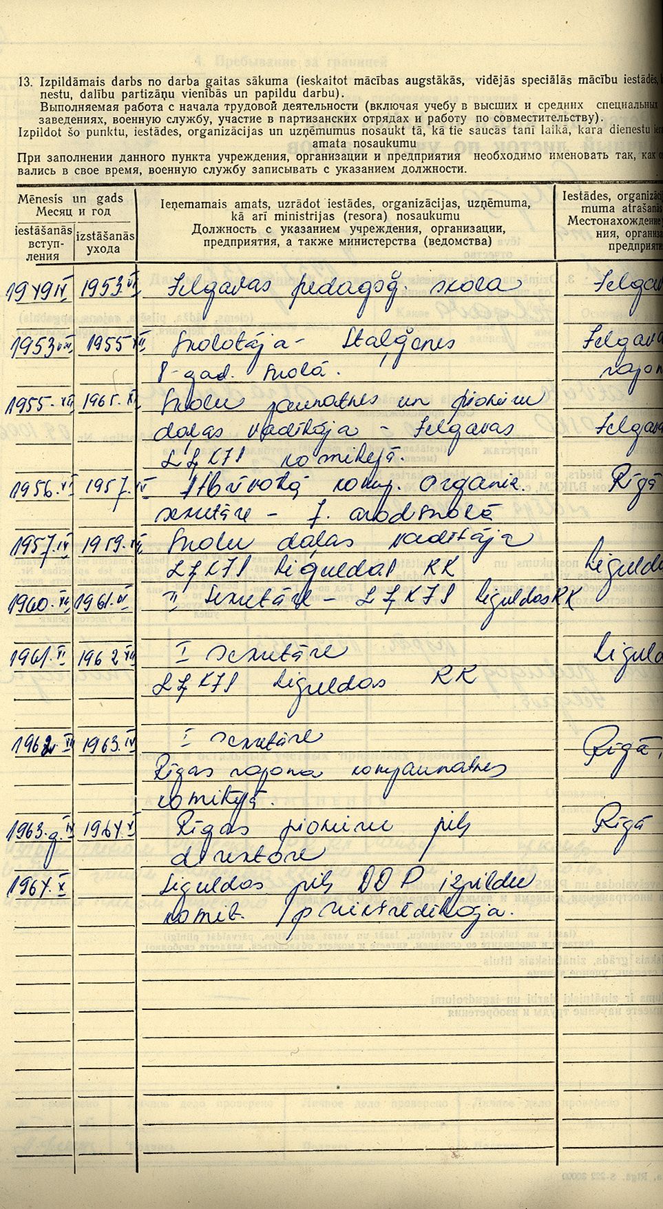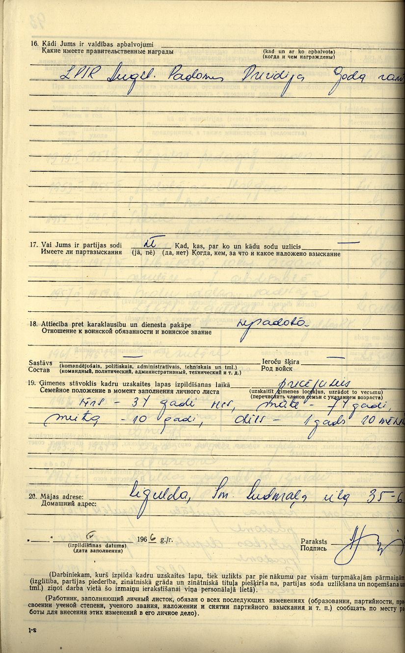 Pionieru pils direktores Ausmas Skripas personālā kadru uzskaites lapa.