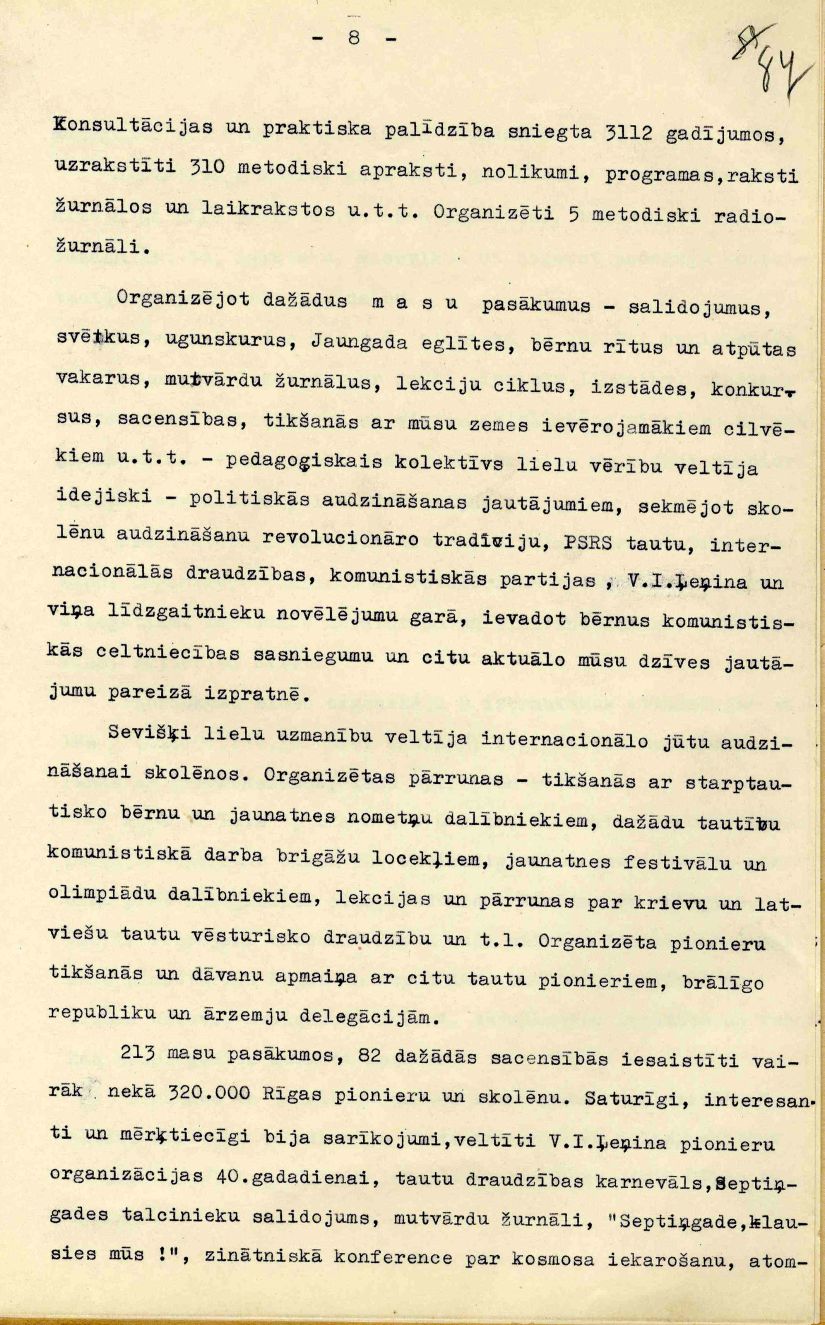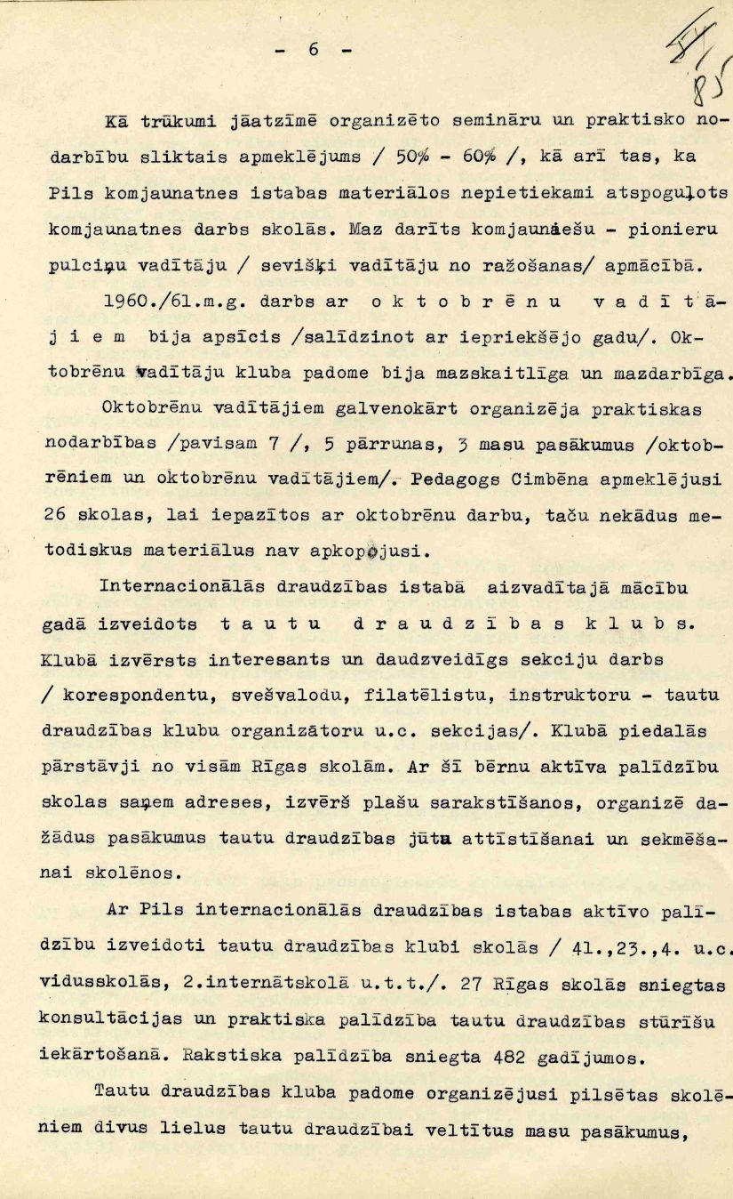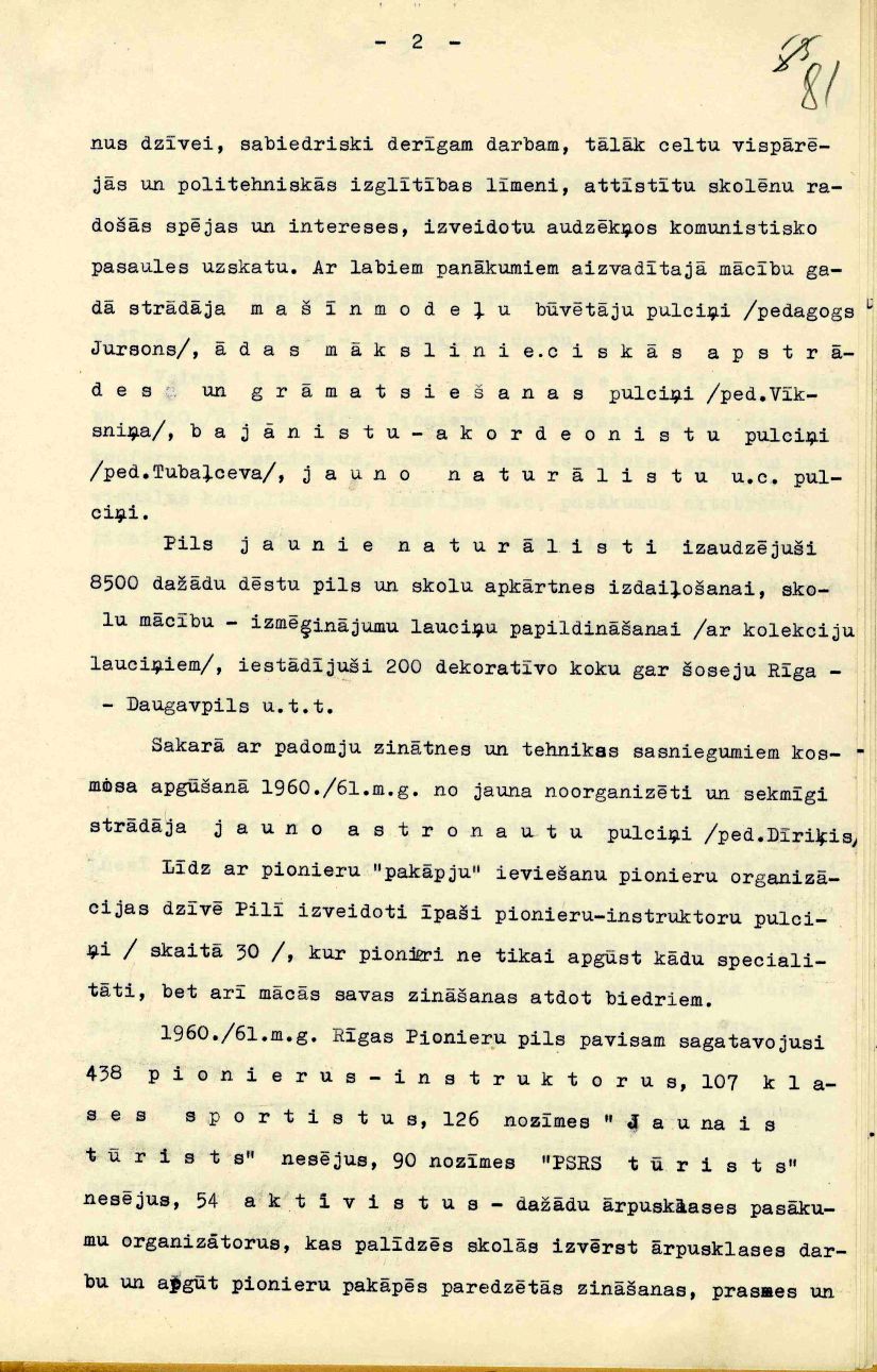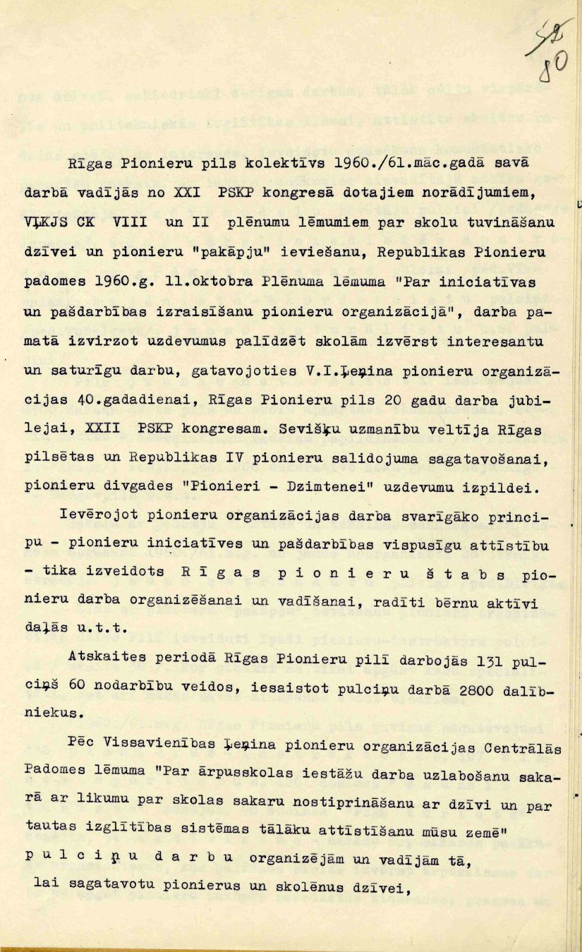 Rīgas Pionieru pils mācību un audzināšanas darba atskaite 1960./61. mācību gadam, iesniegta Rīgas pilsētas Tautas izglītības nodaļā.
