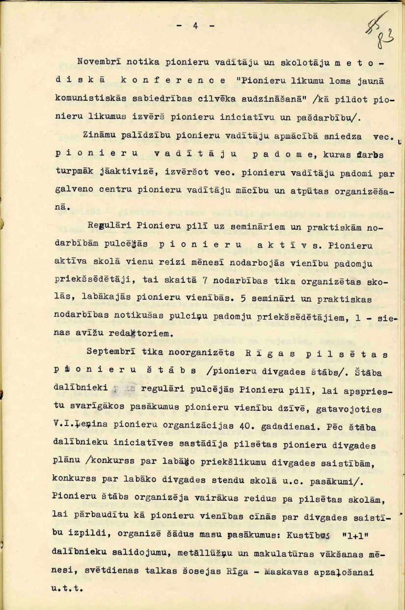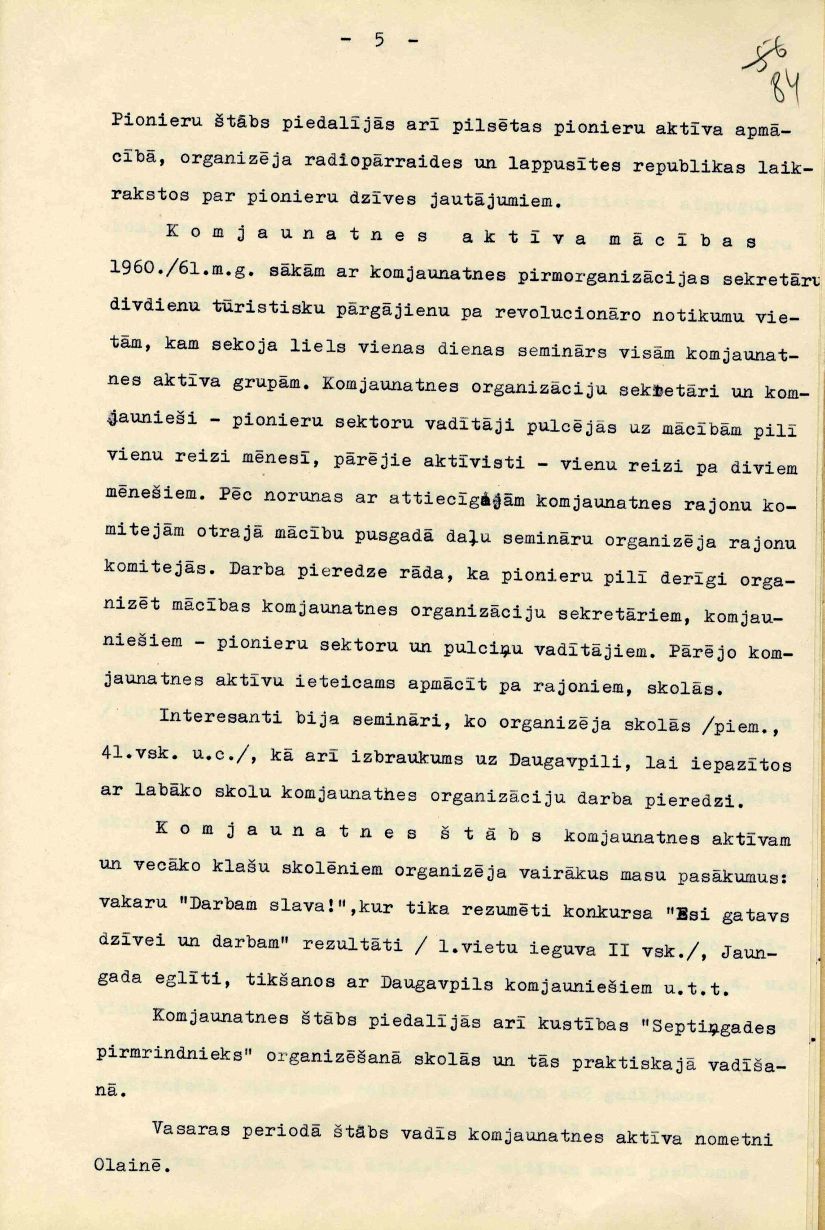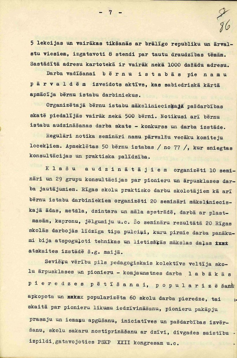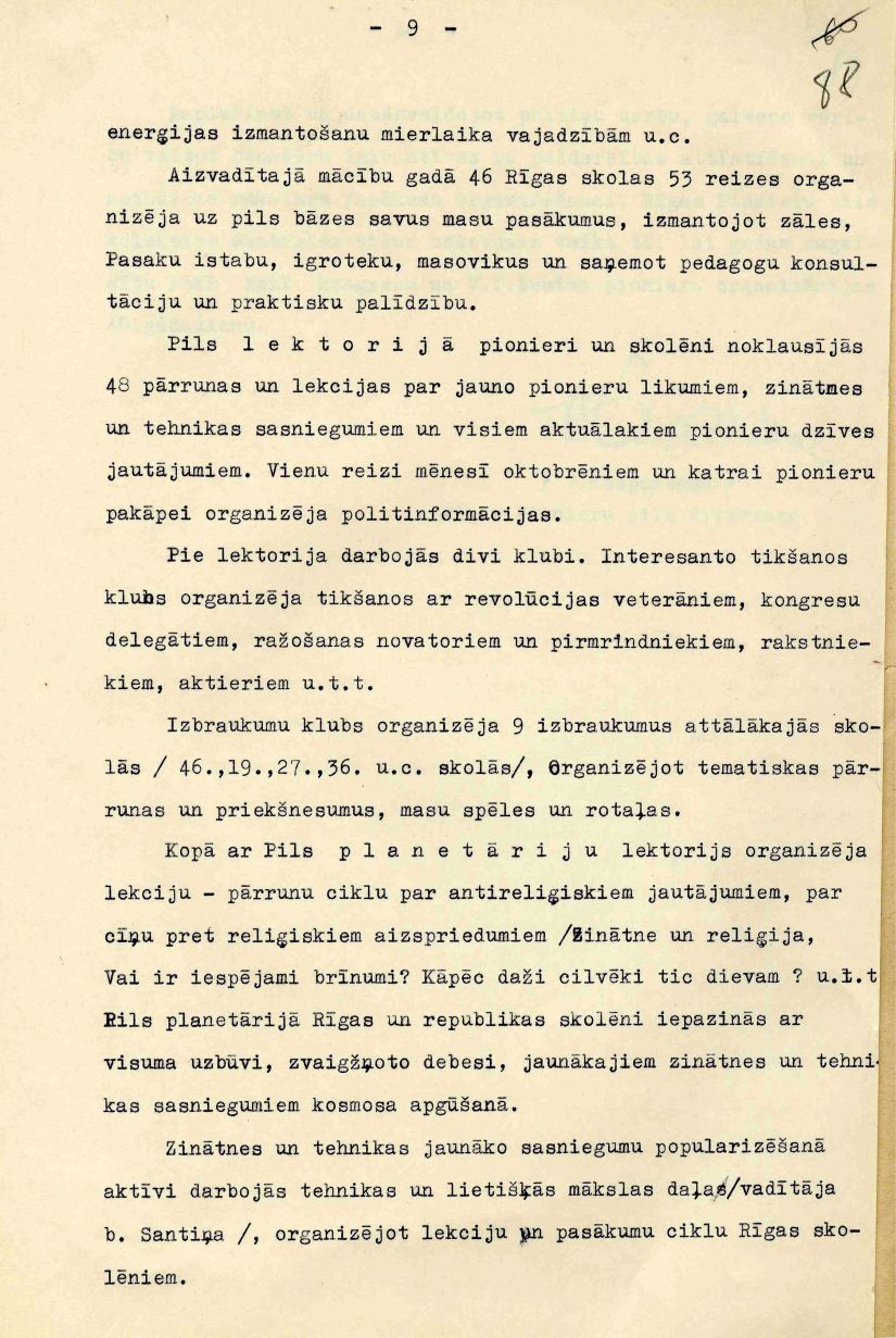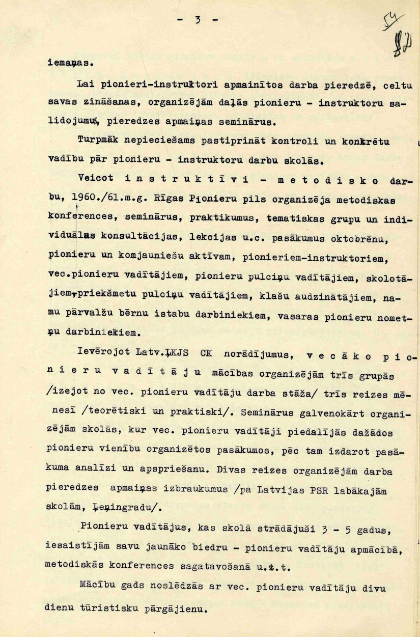 Rīgas Pionieru pils mācību un audzināšanas darba atskaite 1960./61. mācību gadam, iesniegta Rīgas pilsētas Tautas izglītības nodaļā.