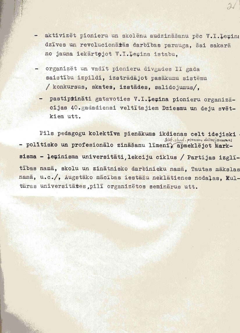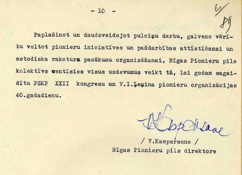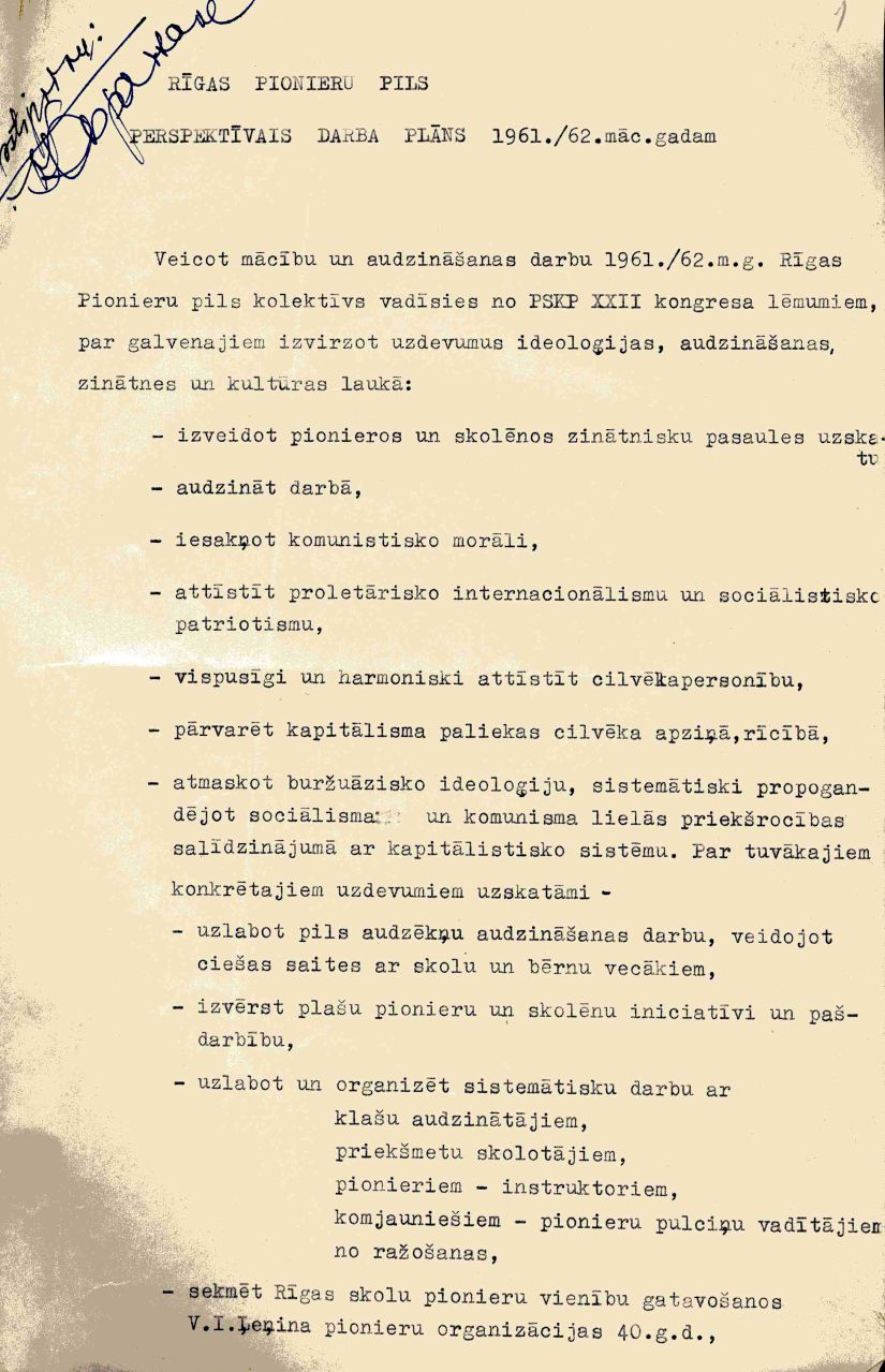 Savukārt Latvijas Komunistiskās partijas Rīgas pilsētas komiteja 1965. gada 28. aprīlī pieņēma lēmumu Nr. 210 „Par ārpusskolu kultūrizglītības iestāžu darba uzlabošanu ar bērniem un pusaudžiem”. Un neiztiek jau bez formulējuma, ka Pionieru pils darba galvenais mērķis sniegt vispusīgu palīdzību jaunās paaudzes komunistiskajā audzināšanā.
