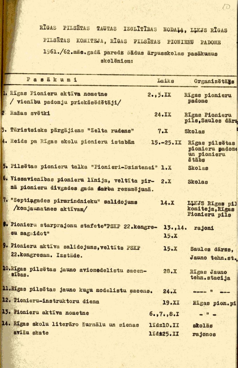 Rīgas Pionieru pils ārpusskolas pasākumi skolēniem 1961./62. mācību gadā.