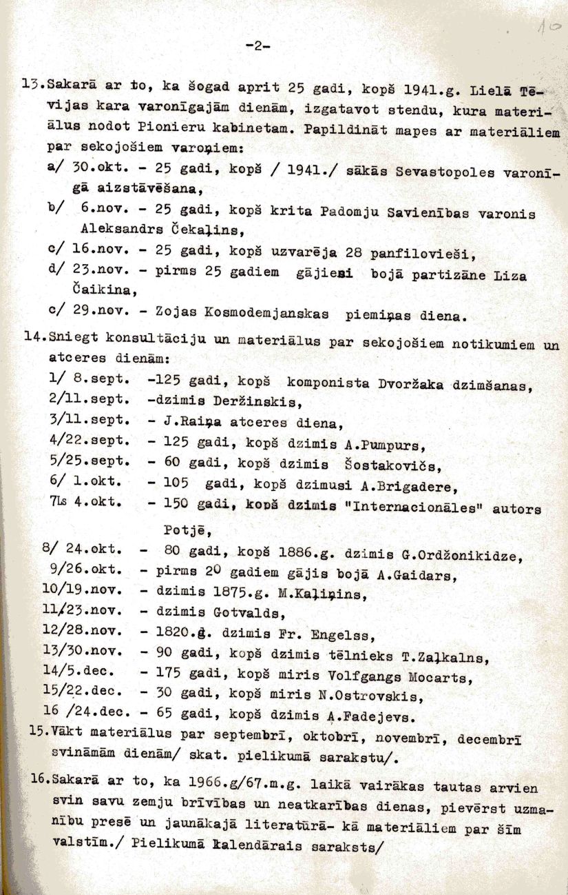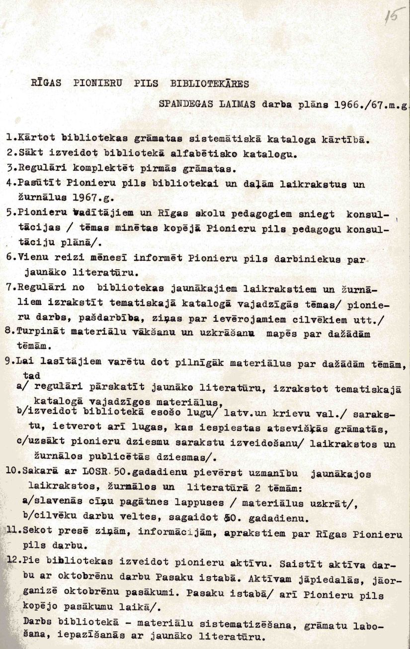 Rīgas Pionieru pils bibliotekāres Laimas Spandegas darba plāns. 1966./67. mācību gads.