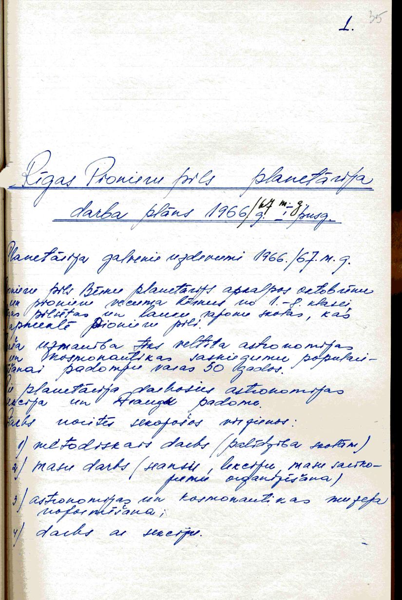 Rīgas Pionieru pils Planetārija darba plāns 1966./67. mācību gadā.