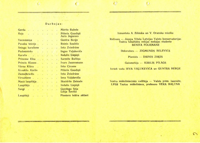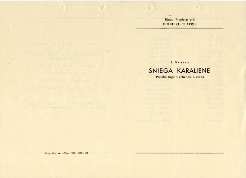 Programma Rīgas Pionieru pils Pionieru teātra izrādei Sniega karaliene.1967. gads.