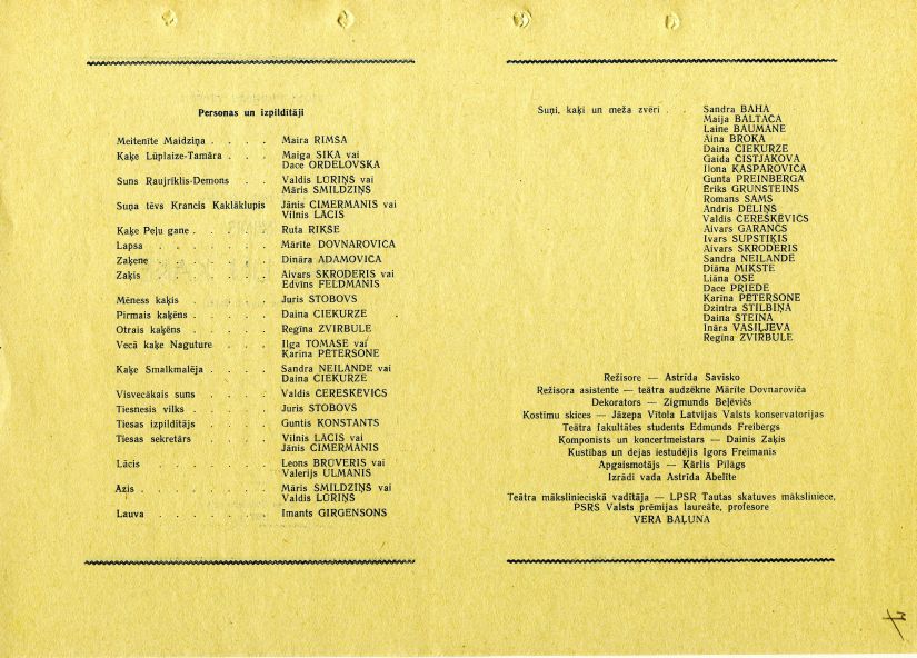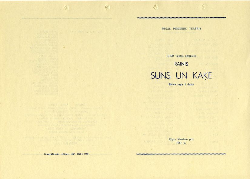 Programma Rīgas Pionieru pils Pionieru teātra izrādei Raiņa lugai "Suns un kaķe." 1967. gads.