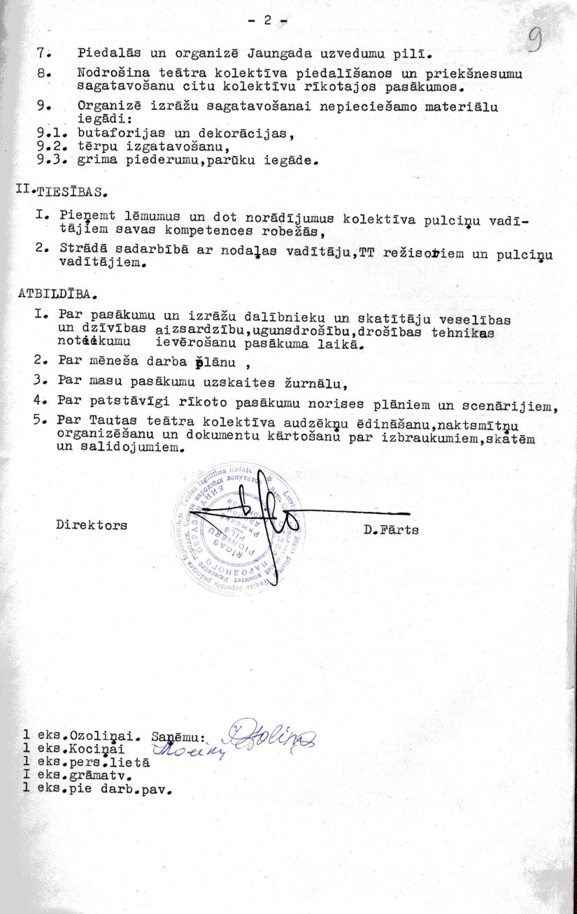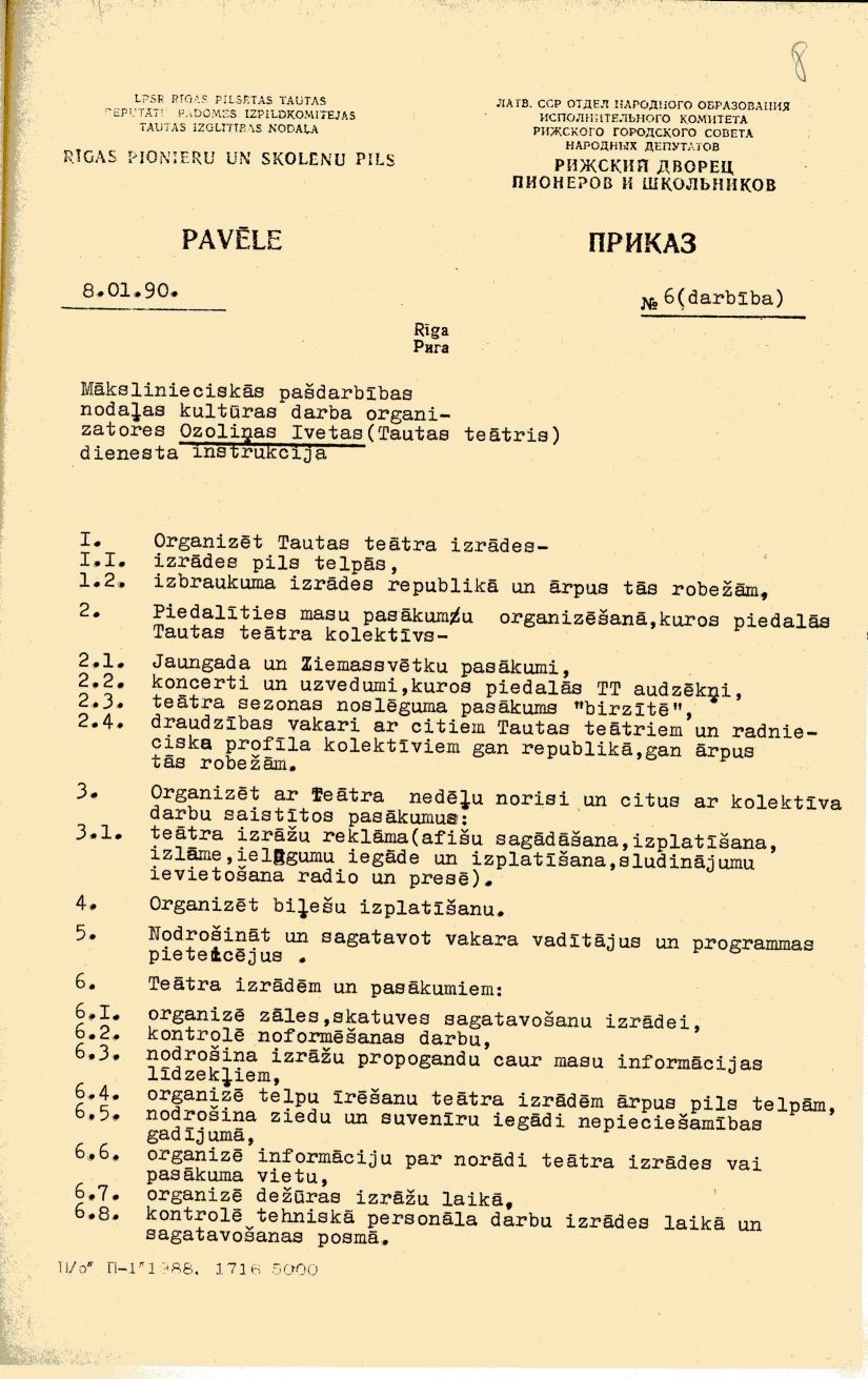 Rīgas Skolēnu pils direktora Daiņa Fārta pavēle Nr. 6. par Mākslinieciskās pašdarbības nodaļas kultūras darba organizatores Ivetas Ozoliņas dienesta instrukciju. 1990. gada 8. janvāris.