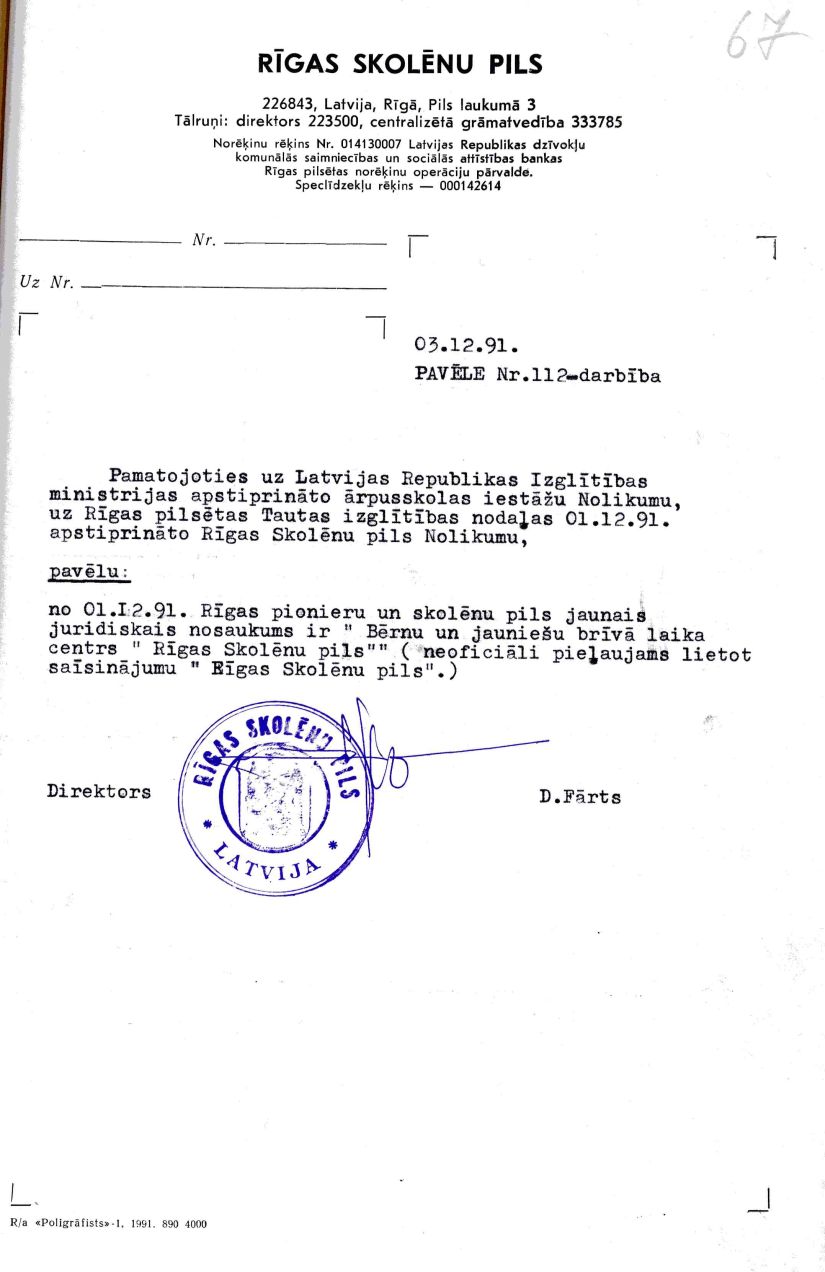 Rīgas Skolēnu pils direktora Daiņa Fārta pavēle Nr. 112. par Rīgas Pionieru un skolēnu pils jauno juridisko nosaukumu Bērnu un jauniešu brīvā laika centrs "Rīgas Skolēnu pils". 1991. gada 3. decembrī.