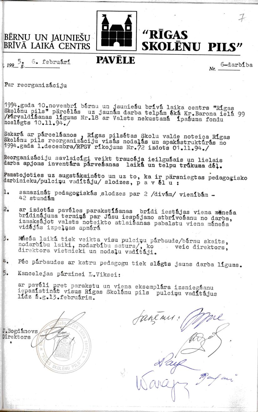 Rīgas Skolēnu pils direktora Jura Bogdanova pavēle Nr. 6. par Rīgas Skolēnu pils jaunajām darba telpām Kr. Barona ielā 99. 1991. gada 6. februārī.