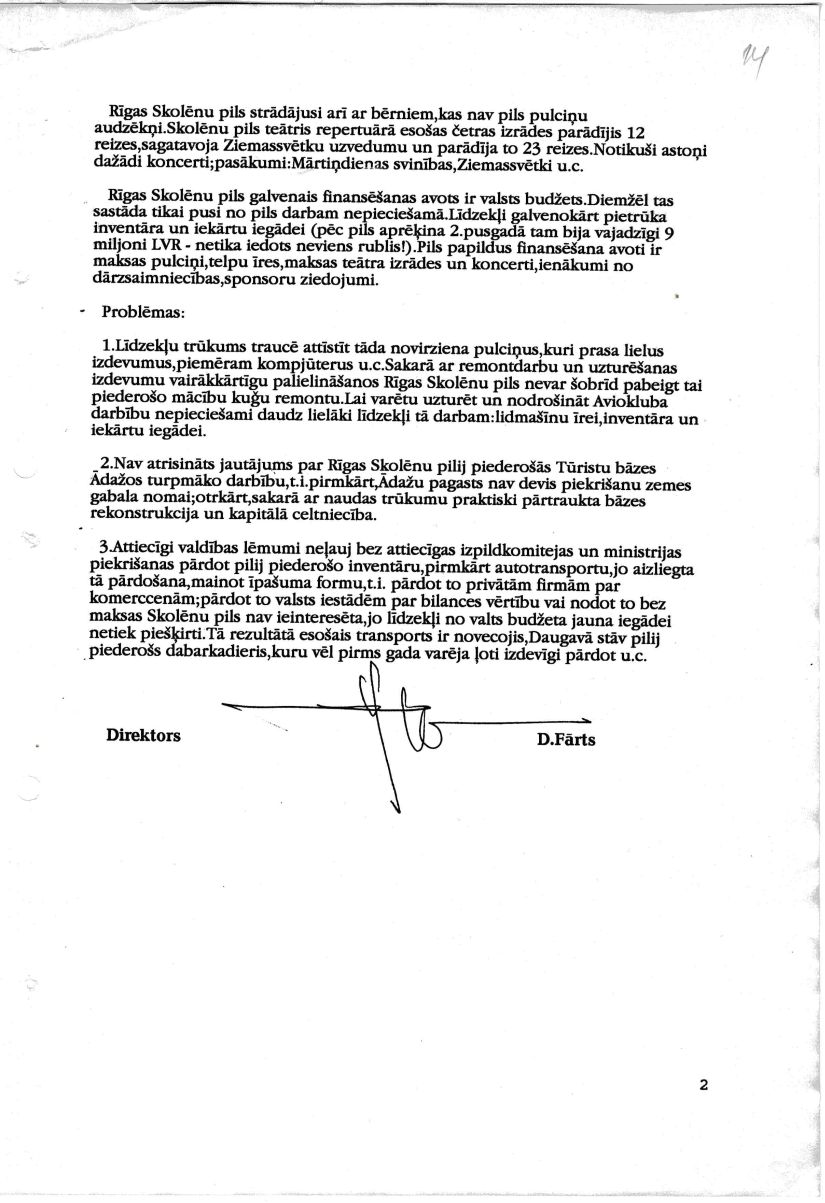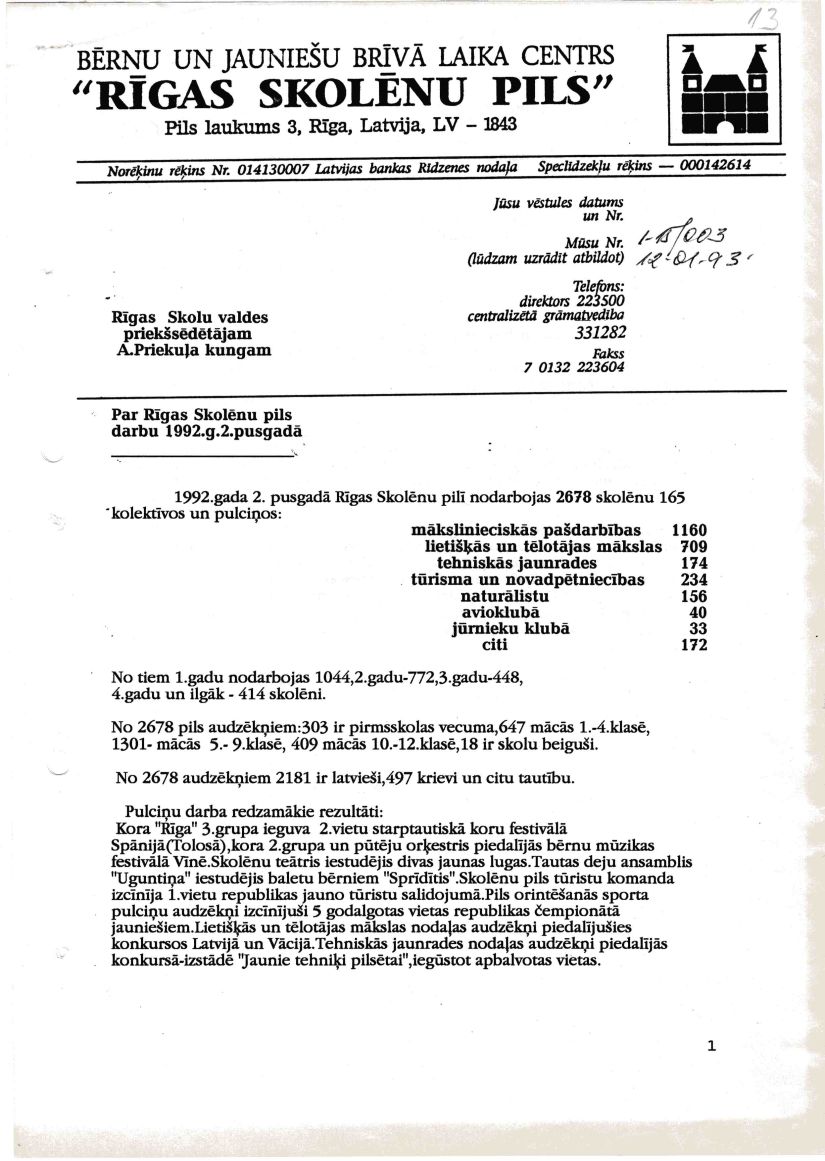 Rīgas Skolēnu pils direktora Daiņa Fārta vēstule Rīgas Skolu valdes priekšsēdētājam Andrim Priekulim par Rīgas Skolēnu pils darbu 1992. gada otrā pusgadā. 1992. gads.