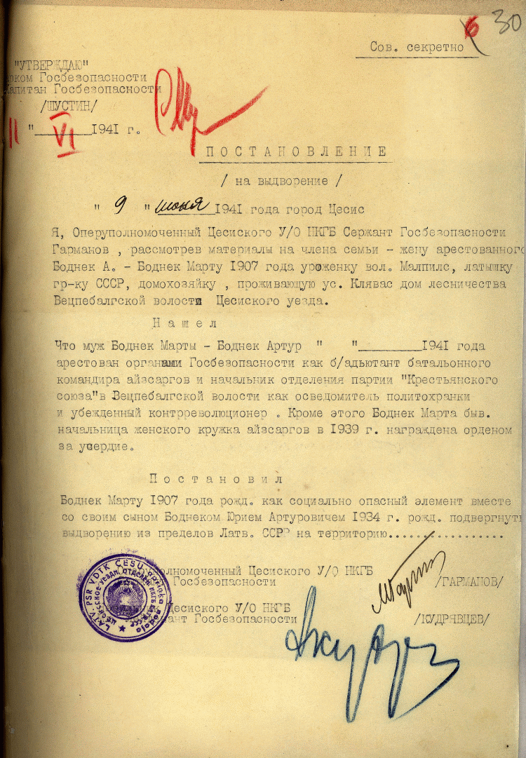 The authorised decision of Semyon Shustin, State Security Captain of the Latvian SSR Peoples Commissariat for State Security, for the deportation of Marta Bodniece.